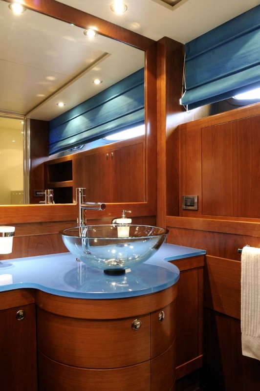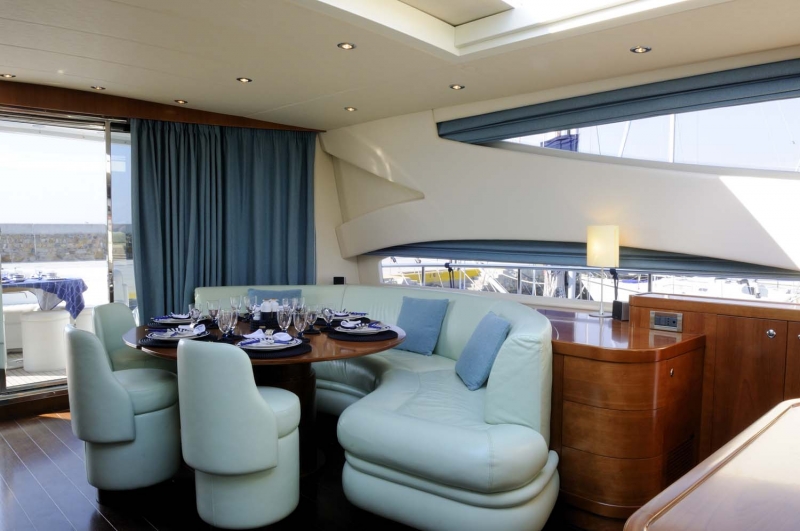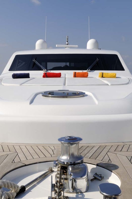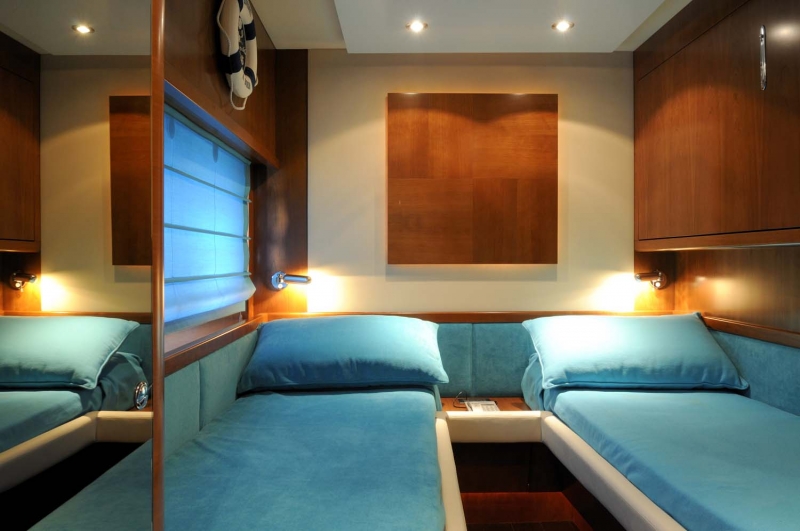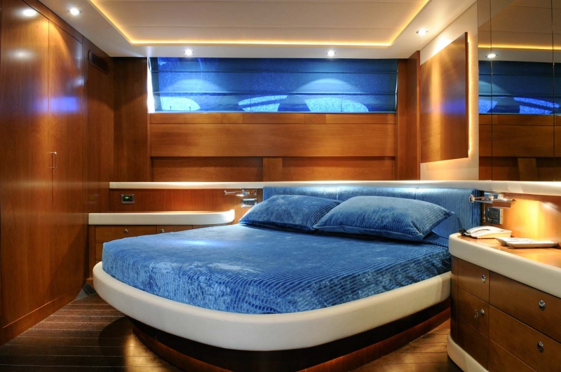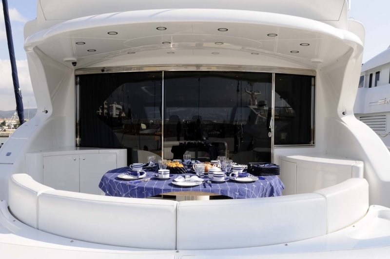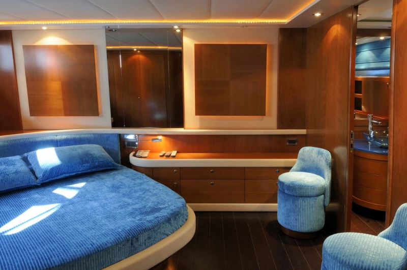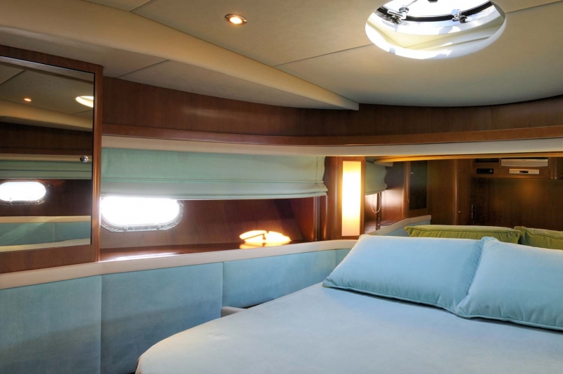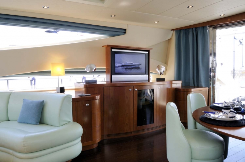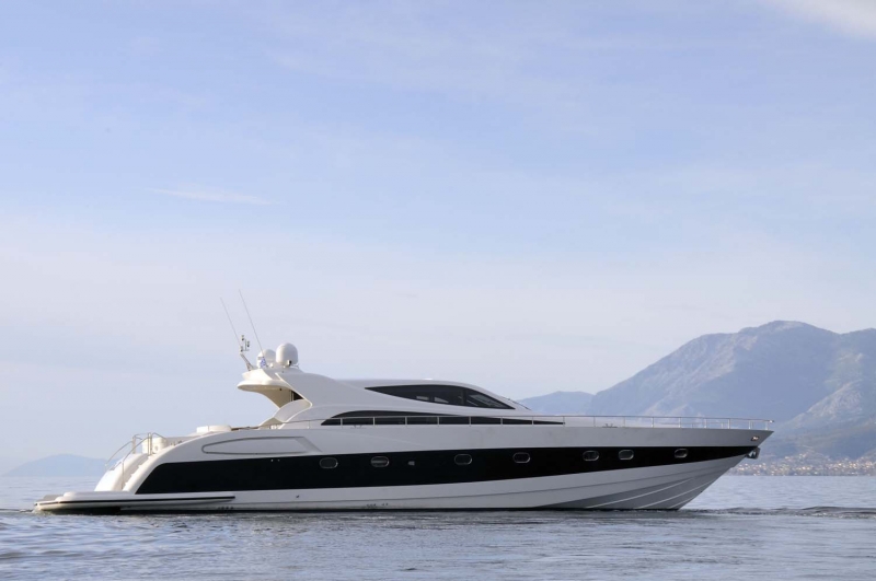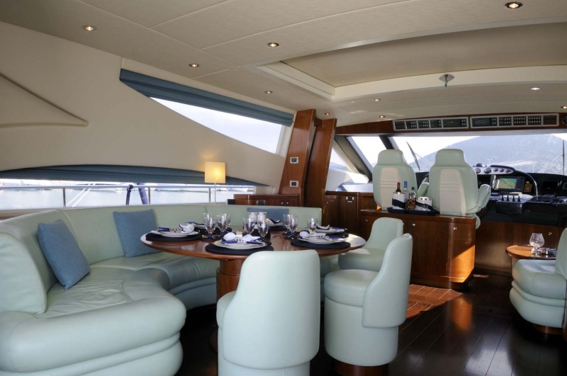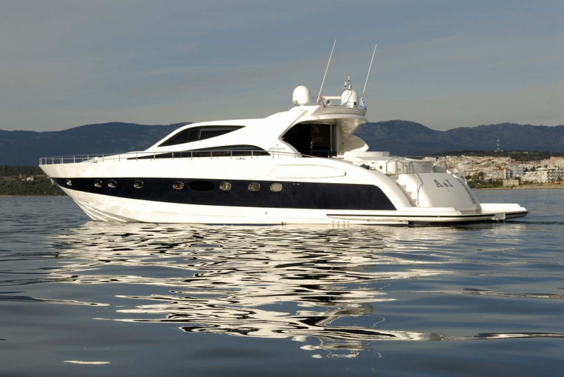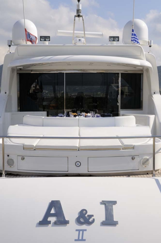 M/Y A&I (AI) is the epitome of the high performance open style motor yacht that is so popular in the Mediterranean. Now she is offered fully crewed for charter in Greece and Greek islands. This futuristic looking vessel is powered by twin 1,800 hp Caterpillar diesels coupled to Arneson surface drives that give her a heady top speed. M/Y A&I (AI) provides plenty of fun while at anchor, with her large teak water sports platform and two huge sun pads. There is absolutely no competition for this ALFAMARINE 78 yacht and fastest charter yacht in the Greek Market looking stunning when cruising at 44 knots ! Professional crew of 3/4 and accommodation of 8-10 guests in 4 very individual staterooms. The panoramic living room below is perfectly air conditioned and has large windows and is separated from the cockpit by a sliding steel door. The hydraulically operated stern door gives access to the spacious garage which can house a tender of 3.50 m. and an aqua scooter. Her kitchen has a crew entrance and the sleeping area is completely separated from the service areas in order to guarantee maximum privacy for guests. Comfort and quiet reign undisputedly, the decor in cherry wood and bleached oak give a touch of refined elegance to all areas.