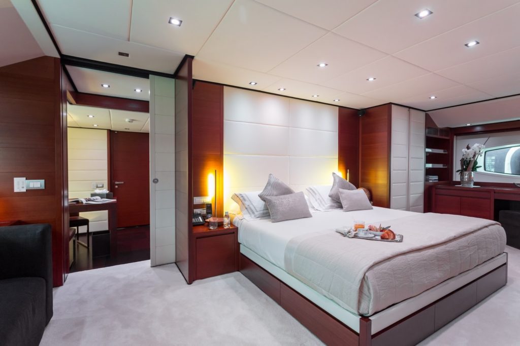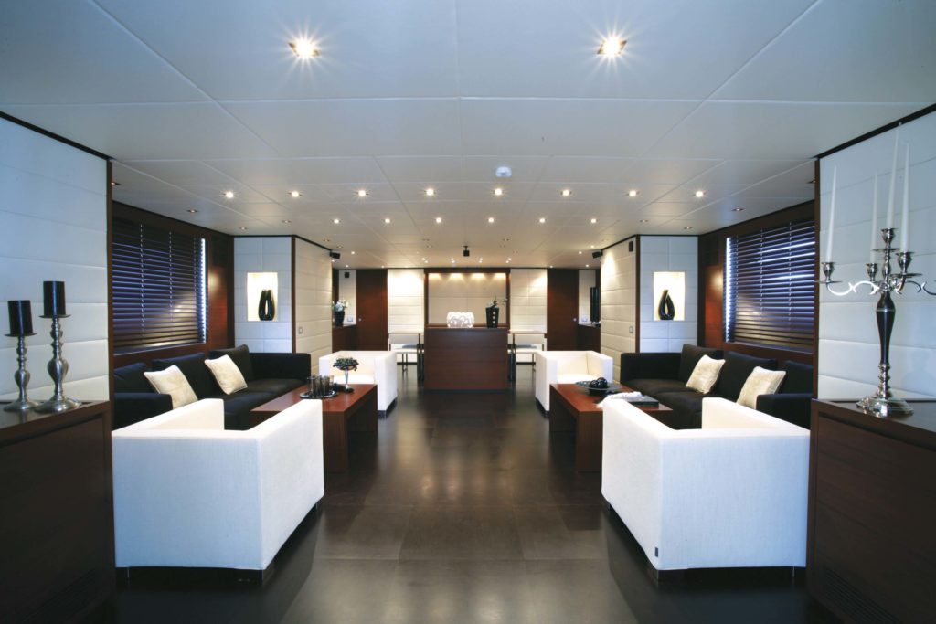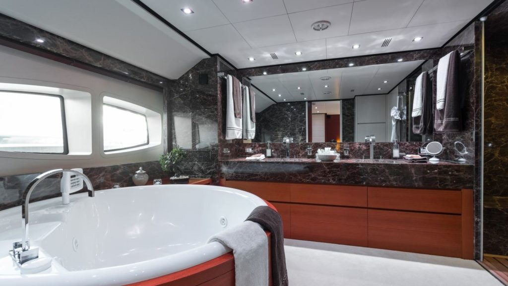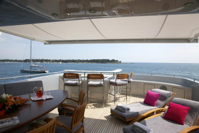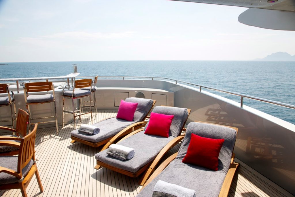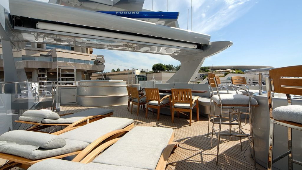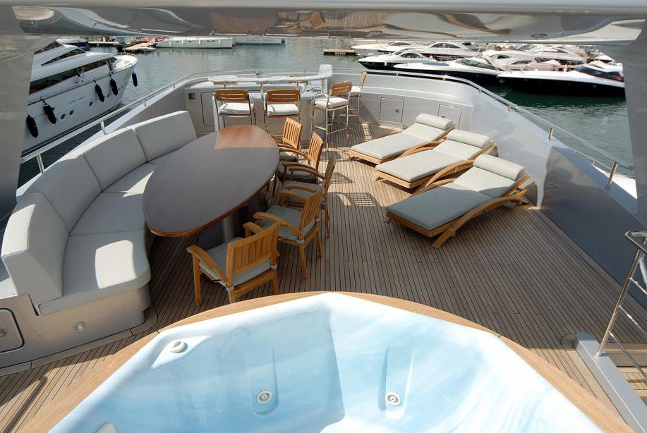 ANNAMIA is a luxury motor yacht offered for yacht charter in the Mediterranean. Easily recognisable by her pure and distinguished lines, she also features a unique and stylish grey hull along with changing colours of her metallic structures. The best features of the yacht are her exterior spaces. Her aft deck is equipped with a large table for al fresco dining and breakfasts and also has a sofa and 2 armchairs. Her extended swim platform is just a few stairs below and this area is mainly used for the watersport enthusiasts w ho wish to to ride the tender or to enjoy the water toys offered. The most popular upper bridge deck of ANNAMIA features a beautiful sky-lounge, a spacious room where all guests can enjoy a cocktail at the bar, watch TV or simply enjoy the panoramic views of the surrounding scenery. Her sundeck above is the usual location for sunbathing as the area features plenty of sun-beds, a large spa pool, fabulous dining table for up to 8 guests, a useful bench and an obligatory bar. M/Y ANNAMIA has a beautifully designed interior. Her main salon offers a living-dining area on the main deck and provides a feeling of space with harmonious, modern and smart décor throughout. Her Master cabin, located on the main deck forward, includes a private access, an office, a dressing and a bathroom with spa pool and hammam. The remaining cabins are located on the lower deck accessed from the main-deck via wide modern stairs. There are two spacious VIP cabins with double bed and two twin cabins with two single beds and possibility of a third one for a child. All cabins have a bathroom and separate audio-visual systems.