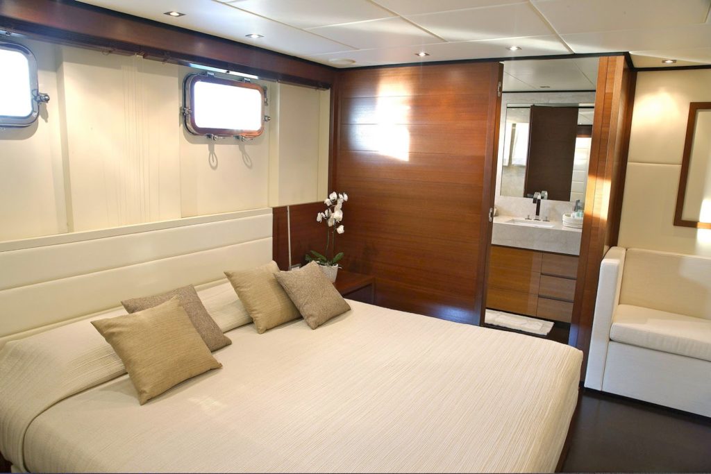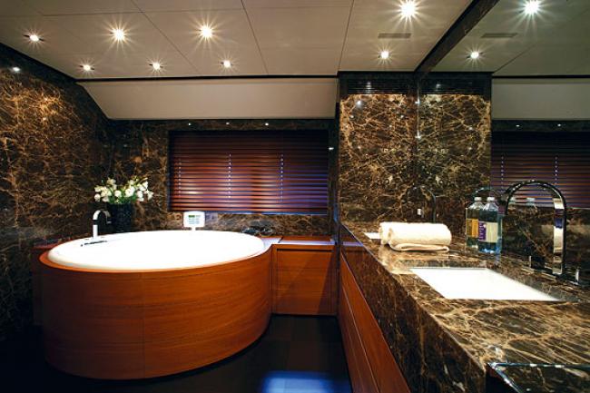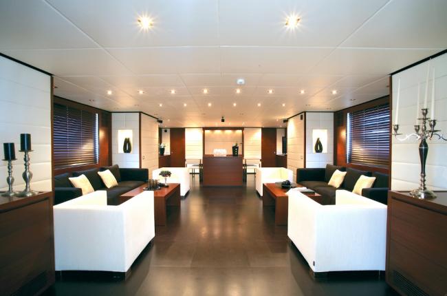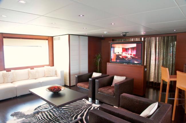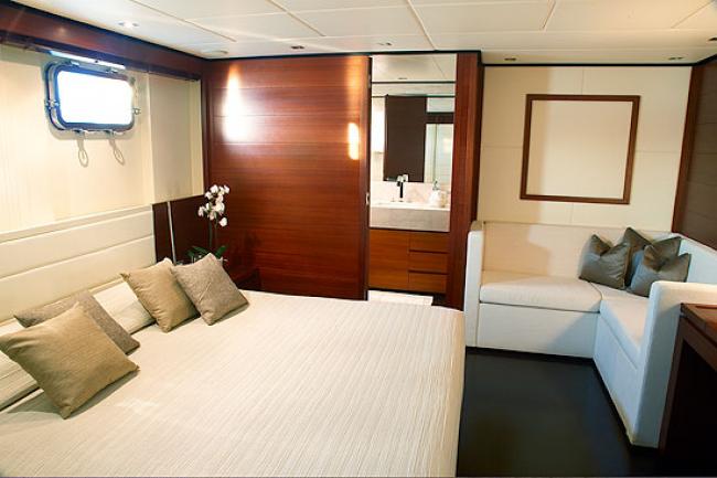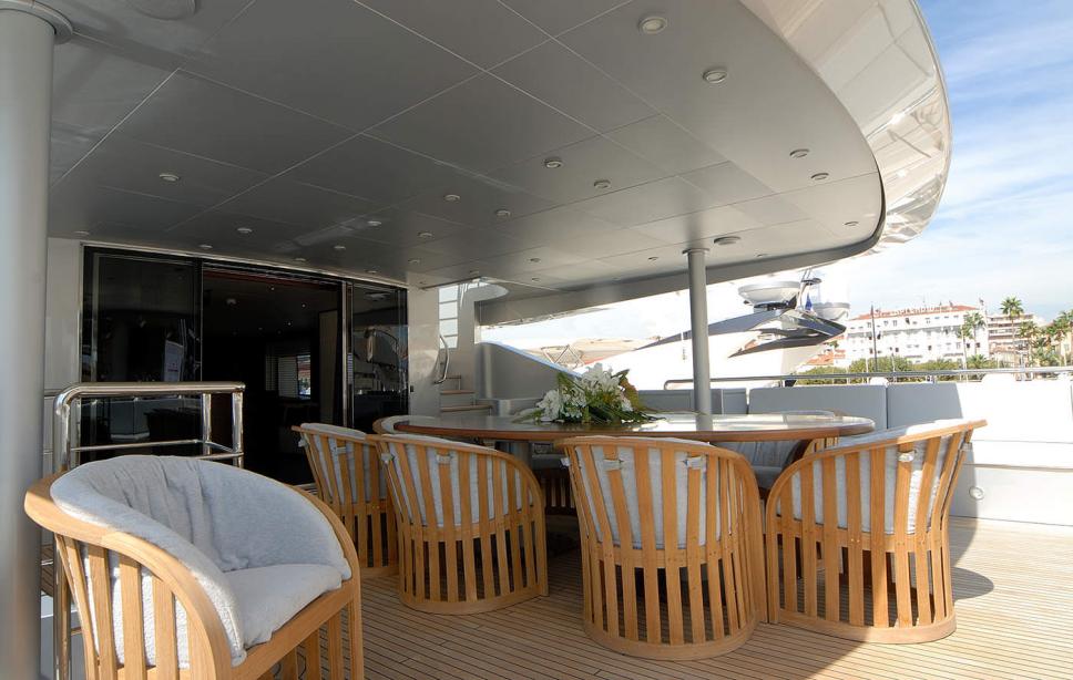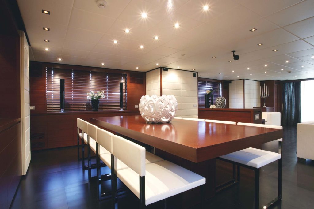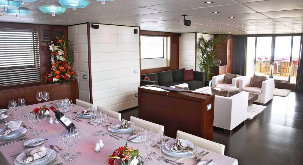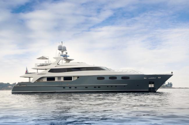 ANNAMIA is a luxury motor yacht offered for yacht charter in the Mediterranean. Easily recognisable by her pure and distinguished lines, she also features a unique and stylish grey hull along with changing colours of her metallic structures. The best features of the yacht are her exterior spaces. Her aft deck is equipped with a large table for al fresco dining and breakfasts and also has a sofa and 2 armchairs. Her extended swim platform is just a few stairs below and this area is mainly used for the watersport enthusiasts w ho wish to to ride the tender or to enjoy the water toys offered. The most popular upper bridge deck of ANNAMIA features a beautiful sky-lounge, a spacious room where all guests can enjoy a cocktail at the bar, watch TV or simply enjoy the panoramic views of the surrounding scenery. Her sundeck above is the usual location for sunbathing as the area features plenty of sun-beds, a large spa pool, fabulous dining table for up to 8 guests, a useful bench and an obligatory bar. M/Y ANNAMIA has a beautifully designed interior. Her main salon offers a living-dining area on the main deck and provides a feeling of space with harmonious, modern and smart décor throughout. Her Master cabin, located on the main deck forward, includes a private access, an office, a dressing and a bathroom with spa pool and hammam. The remaining cabins are located on the lower deck accessed from the main-deck via wide modern stairs. There are two spacious VIP cabins with double bed and two twin cabins with two single beds and possibility of a third one for a child. All cabins have a bathroom and separate audio-visual systems.