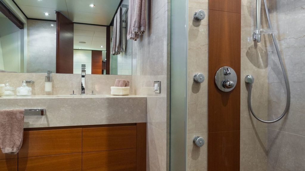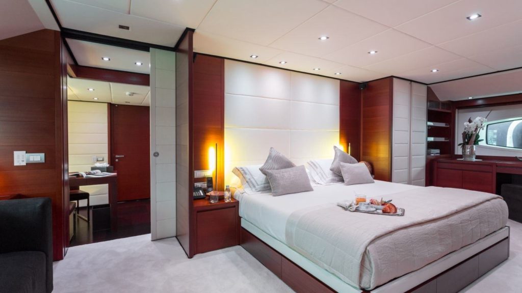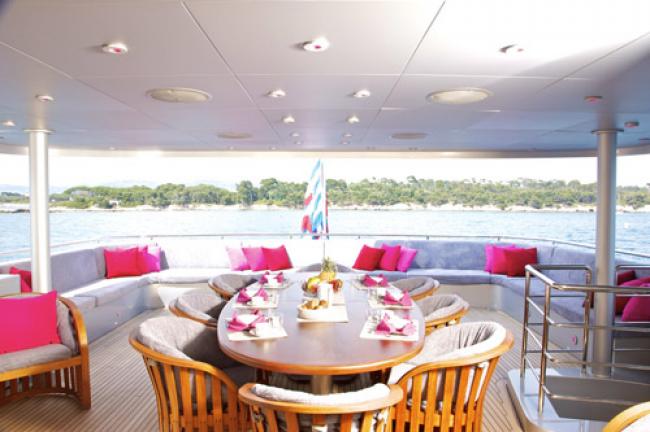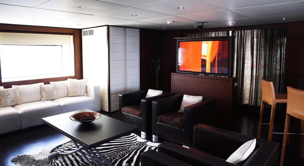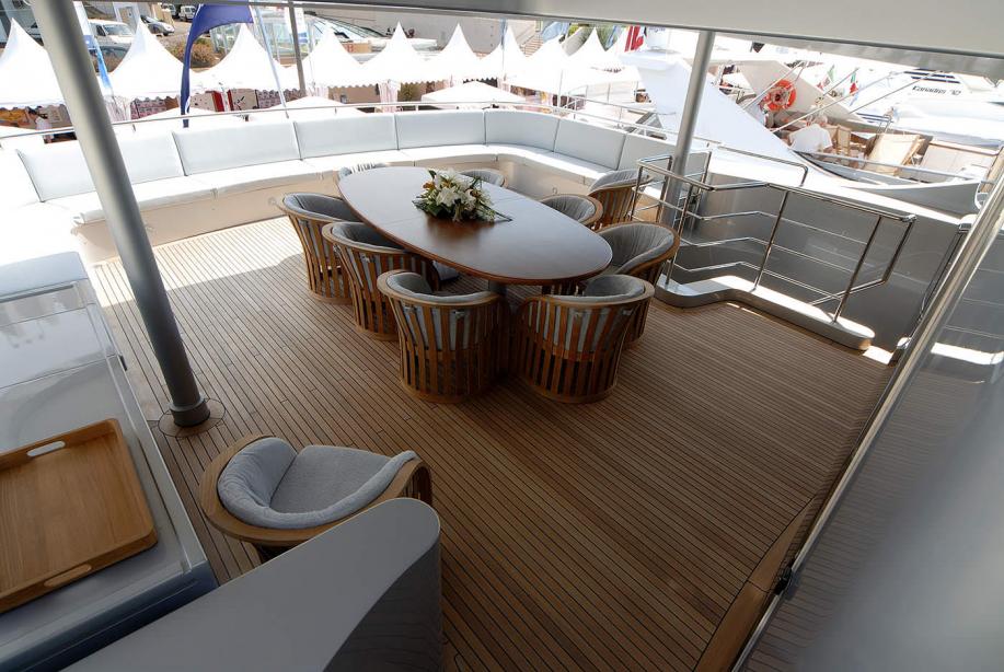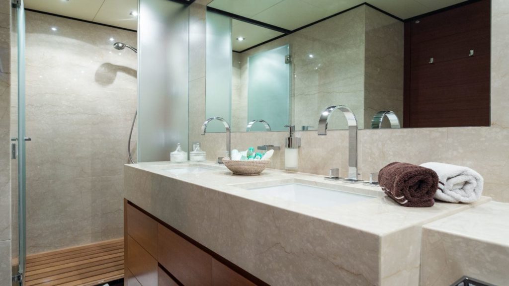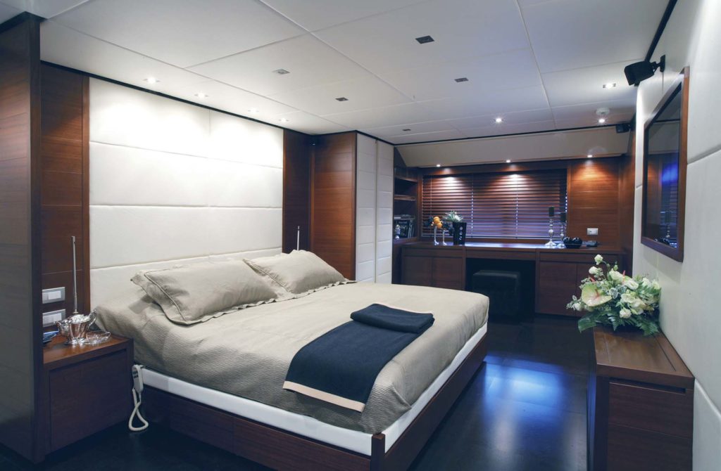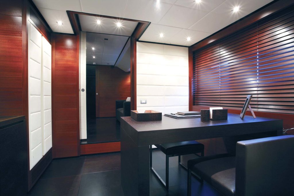 ANNAMIA is a luxury motor yacht offered for yacht charter in the Mediterranean. Easily recognisable by her pure and distinguished lines, she also features a unique and stylish grey hull along with changing colours of her metallic structures. The best features of the yacht are her exterior spaces. Her aft deck is equipped with a large table for al fresco dining and breakfasts and also has a sofa and 2 armchairs. Her extended swim platform is just a few stairs below and this area is mainly used for the watersport enthusiasts w ho wish to to ride the tender or to enjoy the water toys offered. The most popular upper bridge deck of ANNAMIA features a beautiful sky-lounge, a spacious room where all guests can enjoy a cocktail at the bar, watch TV or simply enjoy the panoramic views of the surrounding scenery. Her sundeck above is the usual location for sunbathing as the area features plenty of sun-beds, a large spa pool, fabulous dining table for up to 8 guests, a useful bench and an obligatory bar. M/Y ANNAMIA has a beautifully designed interior. Her main salon offers a living-dining area on the main deck and provides a feeling of space with harmonious, modern and smart décor throughout. Her Master cabin, located on the main deck forward, includes a private access, an office, a dressing and a bathroom with spa pool and hammam. The remaining cabins are located on the lower deck accessed from the main-deck via wide modern stairs. There are two spacious VIP cabins with double bed and two twin cabins with two single beds and possibility of a third one for a child. All cabins have a bathroom and separate audio-visual systems.