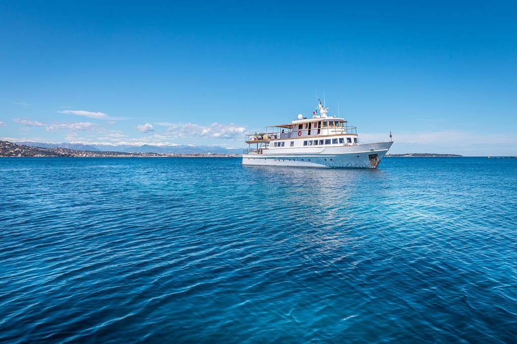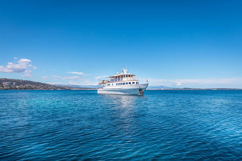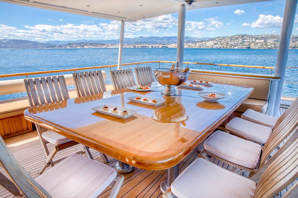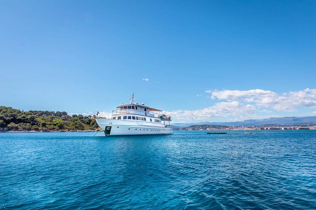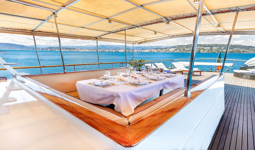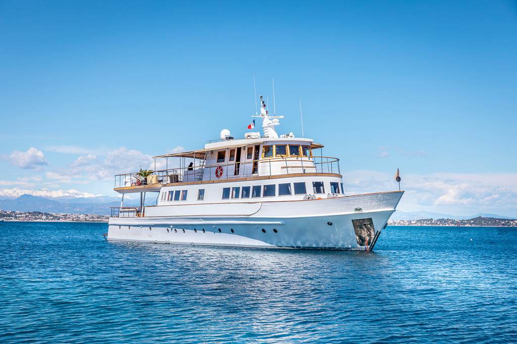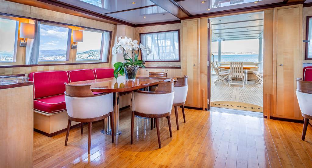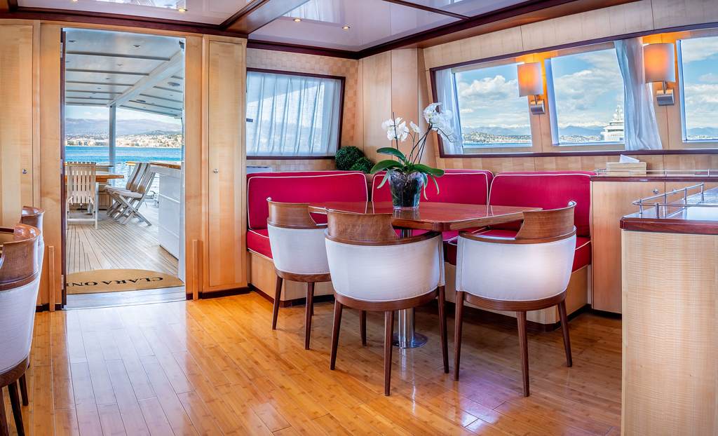 M/Y Clara One is an impressive 32m crewed wooden motor yacht developed at Chantier de L’Esterel in 1961. She features naval architecture by Petrel as well exterior design and interior styling by The A Group Monaco. With a few decades on her, this gentleman’s motor may not have the glitz and gadgetry of 21st century yachts, but if you are in the market for a classic with character, motor yacht Clara One is a far cry from bland and boring. Refitted in 2014 and 2018, this classic yacht presents original features and stands out from the crowd with her retro lines and timeless appeal. Boasting 7 Cabins all with ensuite, this yacht can accommodate up to 16 guests, and up to 36 while cruising. Her 5 crew are on hand to ensure a smooth and enjoyable stay, while you relax on the spacious deck or dine on the aft deck overlooking the French Riviera CLARA ONE is ideal for large corporate events with a maximum capacity of 150 guests standing or 90 guests seated on both the main and upper deck, she provides a great setting for anything from parties to business events. Her top deck is incredibly spacious, proving a great platform for networking, sunbathing or socialising! Here you can admire your stunning surroundings if cruising, or your neighbour yachts if stationary! The interior also provides ample space to relax or have meetings, with sofas, tables and secluded areas.
