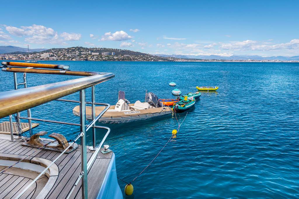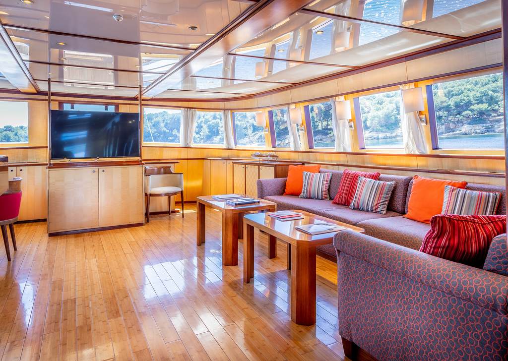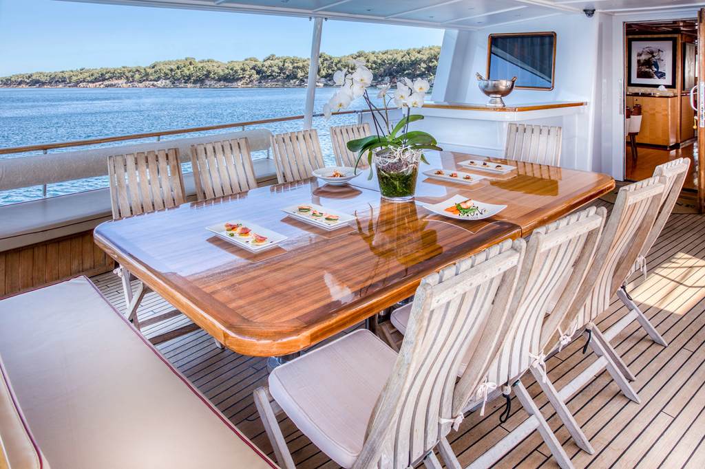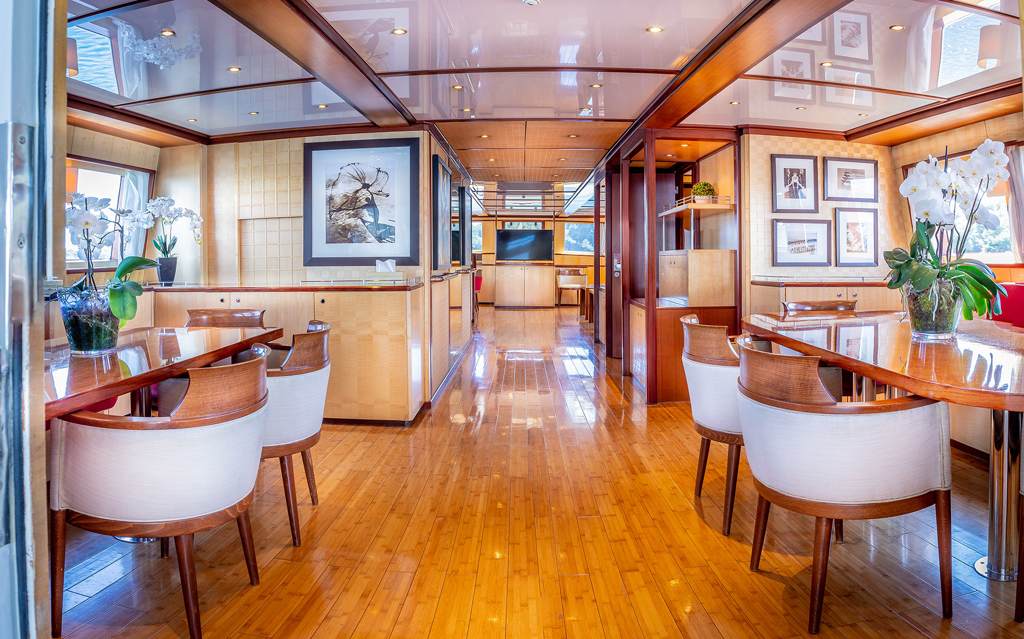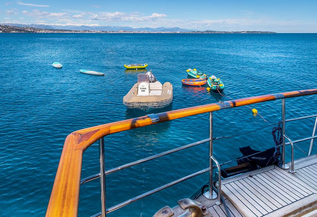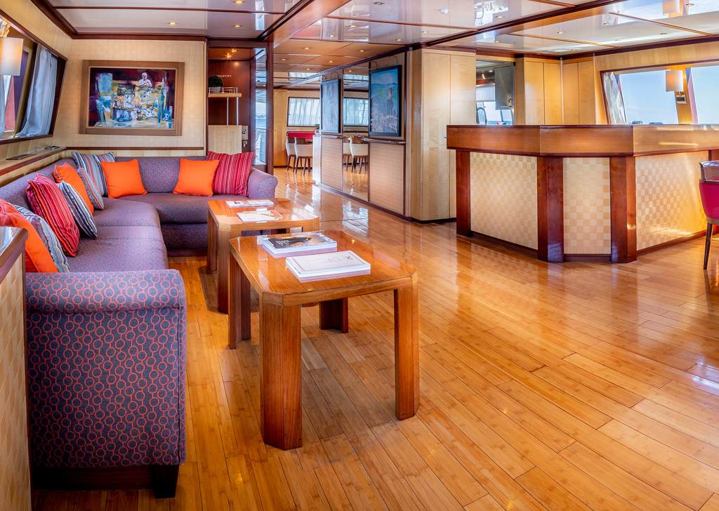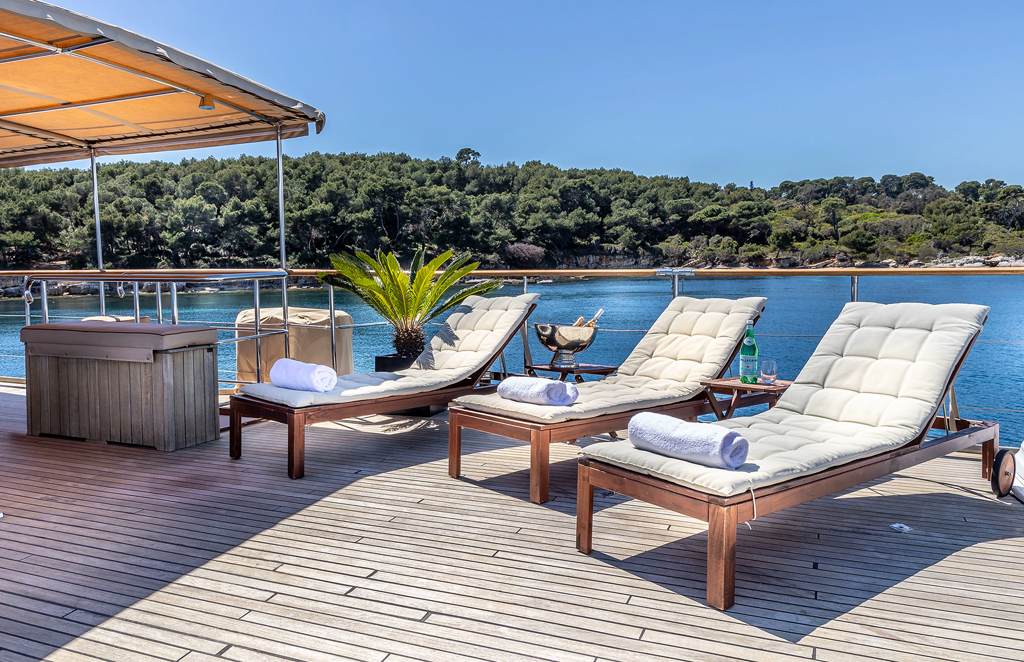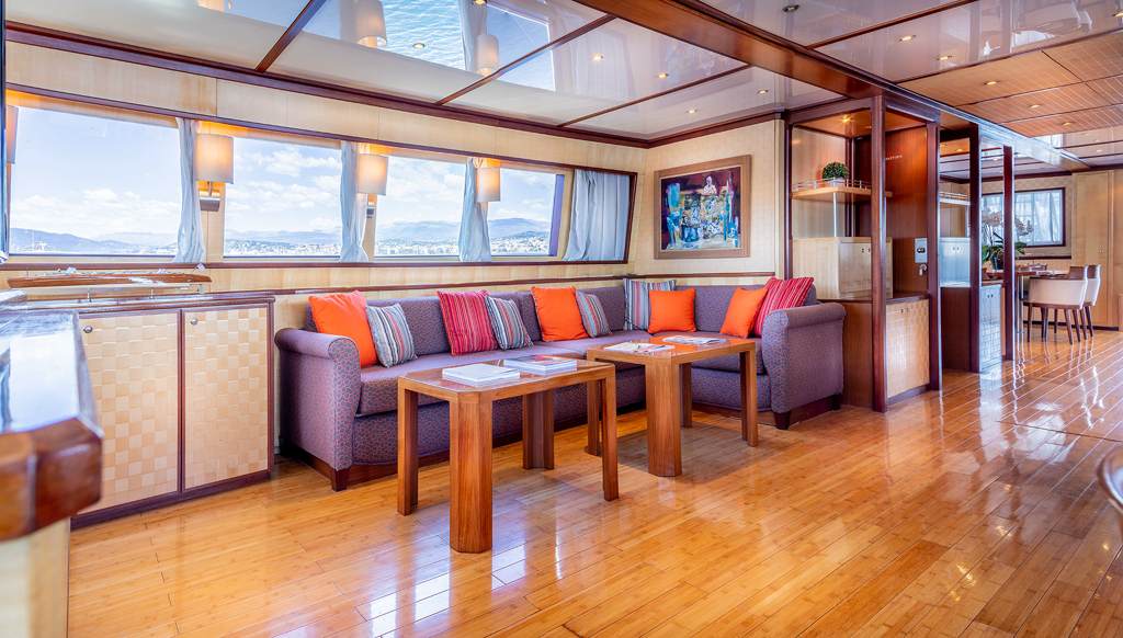 M/Y Clara One is an impressive 32m crewed wooden motor yacht developed at Chantier de L’Esterel in 1961. She features naval architecture by Petrel as well exterior design and interior styling by The A Group Monaco. With a few decades on her, this gentleman’s motor may not have the glitz and gadgetry of 21st century yachts, but if you are in the market for a classic with character, motor yacht Clara One is a far cry from bland and boring. Refitted in 2014 and 2018, this classic yacht presents original features and stands out from the crowd with her retro lines and timeless appeal. Boasting 7 Cabins all with ensuite, this yacht can accommodate up to 16 guests, and up to 36 while cruising. Her 5 crew are on hand to ensure a smooth and enjoyable stay, while you relax on the spacious deck or dine on the aft deck overlooking the French Riviera CLARA ONE is ideal for large corporate events with a maximum capacity of 150 guests standing or 90 guests seated on both the main and upper deck, she provides a great setting for anything from parties to business events. Her top deck is incredibly spacious, proving a great platform for networking, sunbathing or socialising! Here you can admire your stunning surroundings if cruising, or your neighbour yachts if stationary! The interior also provides ample space to relax or have meetings, with sofas, tables and secluded areas.