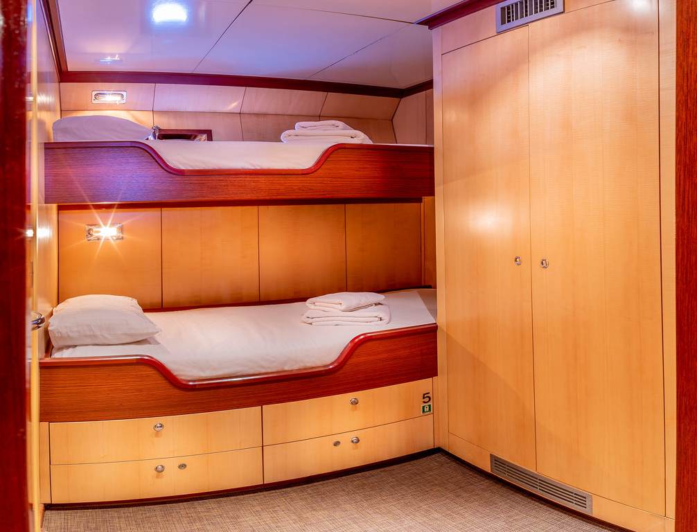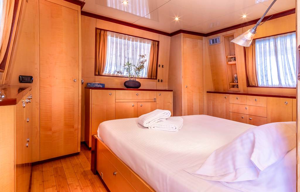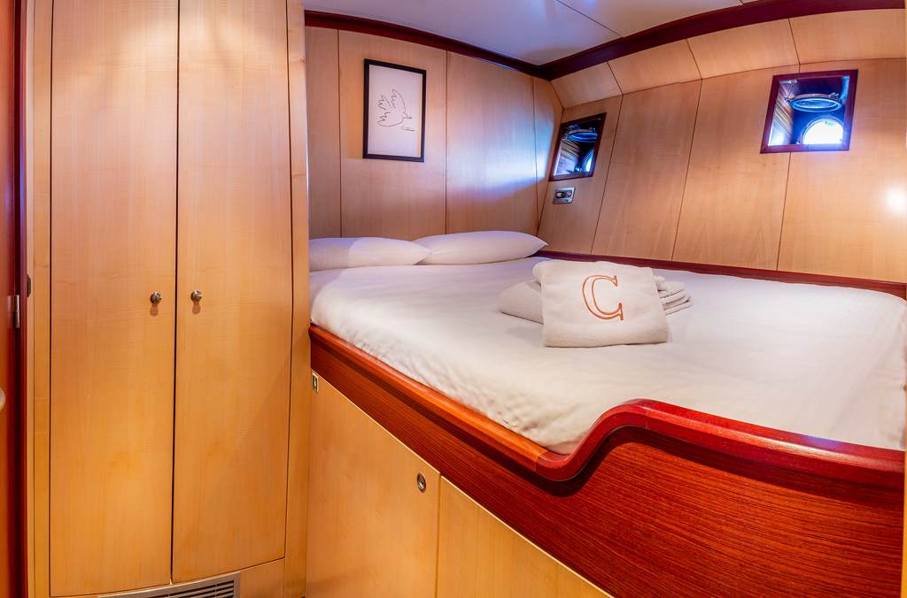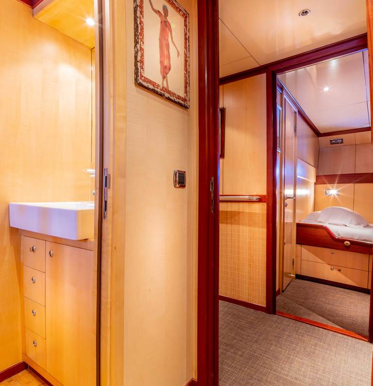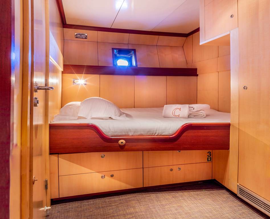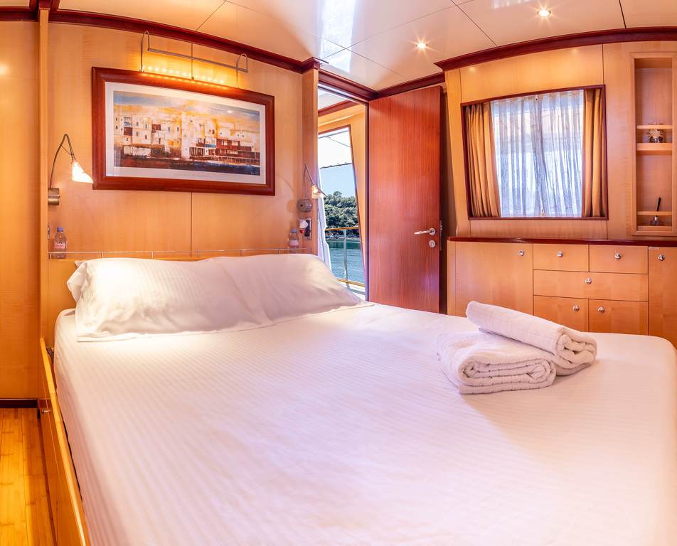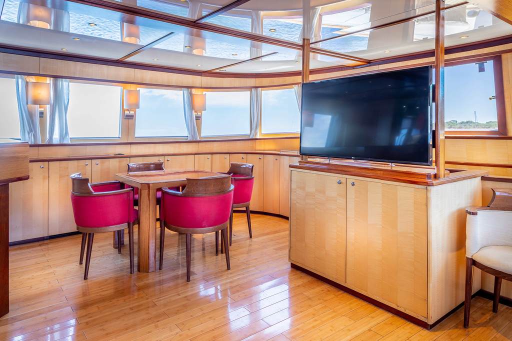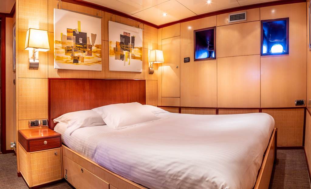 M/Y Clara One is an impressive 32m crewed wooden motor yacht developed at Chantier de L’Esterel in 1961. She features naval architecture by Petrel as well exterior design and interior styling by The A Group Monaco. With a few decades on her, this gentleman’s motor may not have the glitz and gadgetry of 21st century yachts, but if you are in the market for a classic with character, motor yacht Clara One is a far cry from bland and boring. Refitted in 2014 and 2018, this classic yacht presents original features and stands out from the crowd with her retro lines and timeless appeal. Boasting 7 Cabins all with ensuite, this yacht can accommodate up to 16 guests, and up to 36 while cruising. Her 5 crew are on hand to ensure a smooth and enjoyable stay, while you relax on the spacious deck or dine on the aft deck overlooking the French Riviera CLARA ONE is ideal for large corporate events with a maximum capacity of 150 guests standing or 90 guests seated on both the main and upper deck, she provides a great setting for anything from parties to business events. Her top deck is incredibly spacious, proving a great platform for networking, sunbathing or socialising! Here you can admire your stunning surroundings if cruising, or your neighbour yachts if stationary! The interior also provides ample space to relax or have meetings, with sofas, tables and secluded areas.