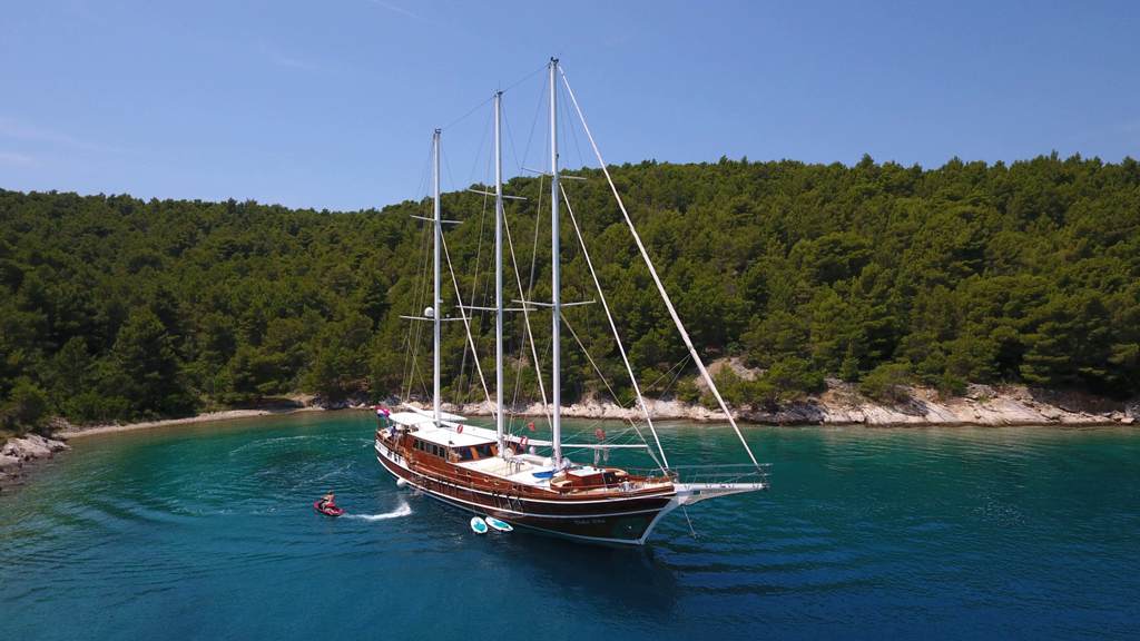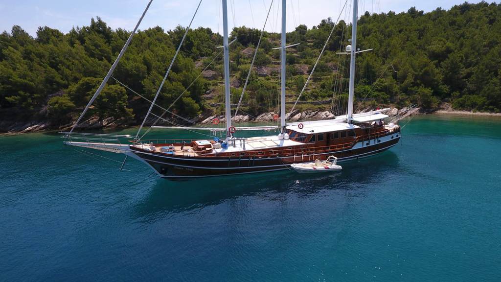 Sailing yacht DOLCE VITA was launched in 2005 by Bodrum Shipyard and refitted in 2015. She measures 34m (111,7ft) and offers accommodation for up to 10 charter guests, in 5 cabins. All the cabins have en-suite bathroom with shower tub, TV, mini bar, DVD system, push flush toilets and individual remote controlled air-conditioning (hot-cold). Finished in high-quality wood and nicely appointed with bed linen and covers, the cabins provide very elegant and inviting environment. There is enough storage space in each cabin. On top of this, each cabin has plenty of daylight. The central indoor area of the gulet is very spacious salon which houses dining area with large white couch with chairs, lounge area with couch and cocktail table and the yacht bar. Very large panoramic windows provide much of a daylight. The salon attracts with its luxurious furnishing and radiates warm elegance and top notch design. The most attractive and fascinating area for outdoor living is the deck of Dolce Vita. She boats with very spacious stern deck, housing wide cushioned leisure sofa, where our guests adore relaxing. Unlike the other gulets, on the stern deck, Dolce Vita has even two dining tables with cushioned sofas and chairs, which provides amazingly spacious outdoor dining area. Newly built hard top provides pleasant stay in this area. Bow deck is another relaxation area which has comfortable sun bathing mattresses, two cushioned benches with cocktail tables and the very attractive Jacuzzi between them, from where an amazing views can be enjoyed. Gulet Dolce Vita is designed to provide a pure luxury and enjoyment. Our professional 5 crew members (captain, chef, waiter, deckhand, hostess) will be a guarantee of superb service. They are carefully chosen among our most experienced crew members and specially trained to provide outstanding service. Our guests will enjoy all sorts of Mediterranean delicacies, blended perfectly with their preferences. Combining a delightful fusion of tradition, exquisite style and comfort, gulet Dolce Vita is the ultimate choice for your sailing holiday on the Adriatic coast.