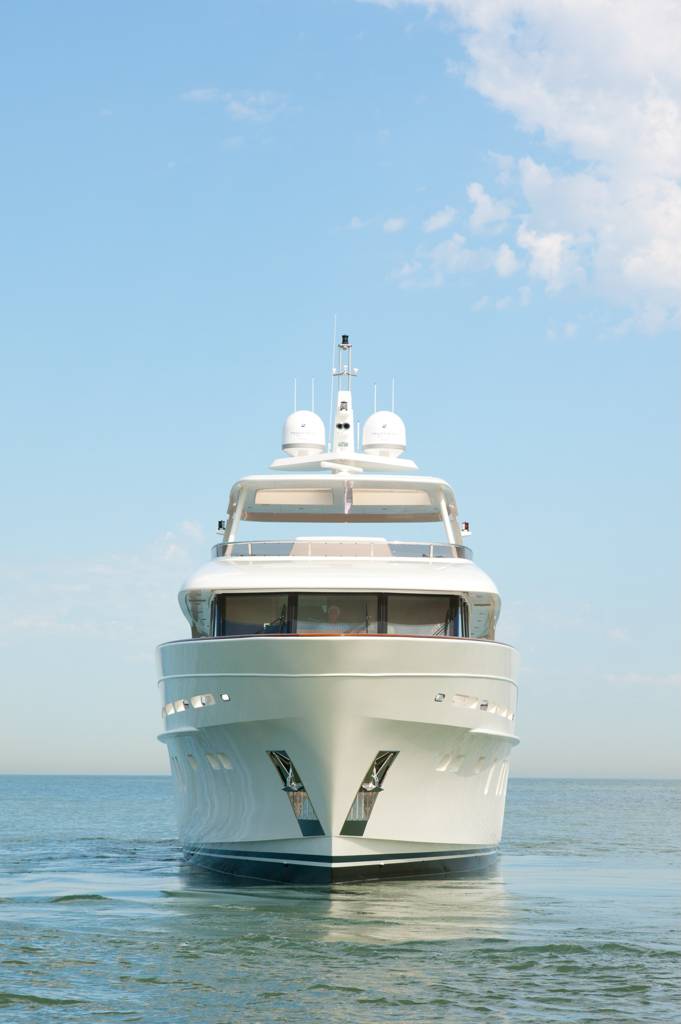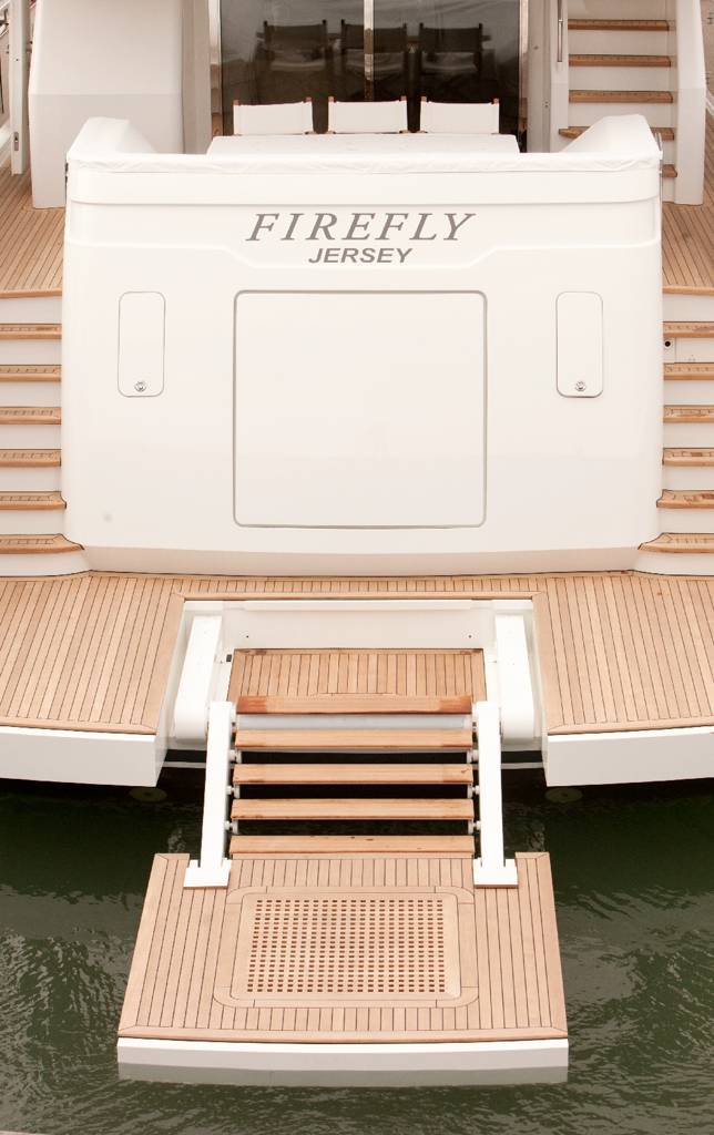 FIREFLY’S large Opacmare extendable stern platform and sea terrace was designed for immediate water access and is fitted with an hydraulic lift system that allows temporary storage of jet skis or a tender when moving between anchorages. Her complement of toys includes a 5.2m Tender Extender, double seat Seadoo, two Seabobs, water skis, towable toys, four bikes and underwater harpoon. Quiet and stable underway or at anchor, thanks to her ultra-low rpm Caterpillar engines and sound proofing, FIREFLY is a pleasure to charter.