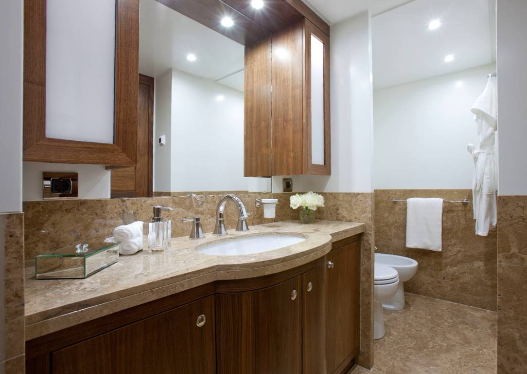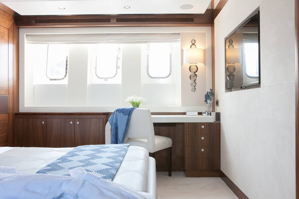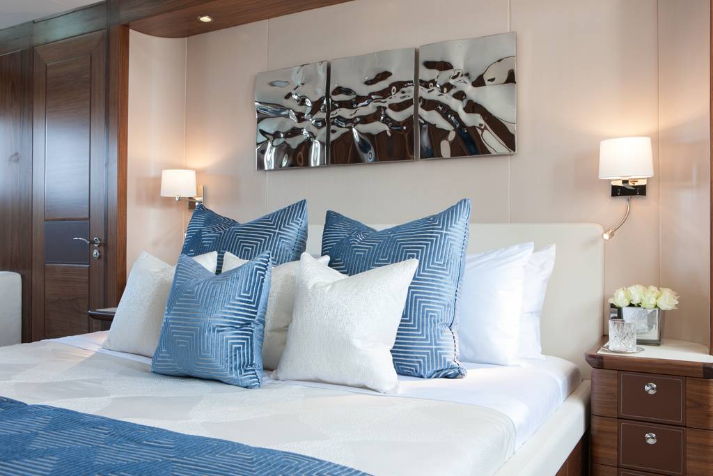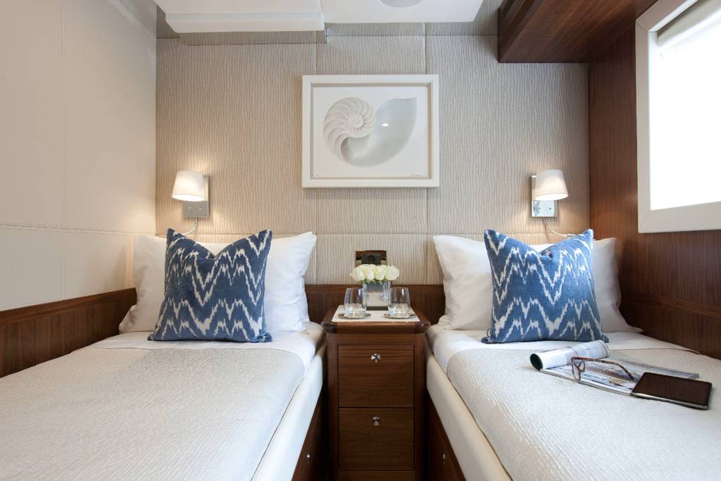 FIREFLY’S large Opacmare extendable stern platform and sea terrace was designed for immediate water access and is fitted with an hydraulic lift system that allows temporary storage of jet skis or a tender when moving between anchorages. Her complement of toys includes a 5.2m Tender Extender, double seat Seadoo, two Seabobs, water skis, towable toys, four bikes and underwater harpoon. Quiet and stable underway or at anchor, thanks to her ultra-low rpm Caterpillar engines and sound proofing, FIREFLY…
