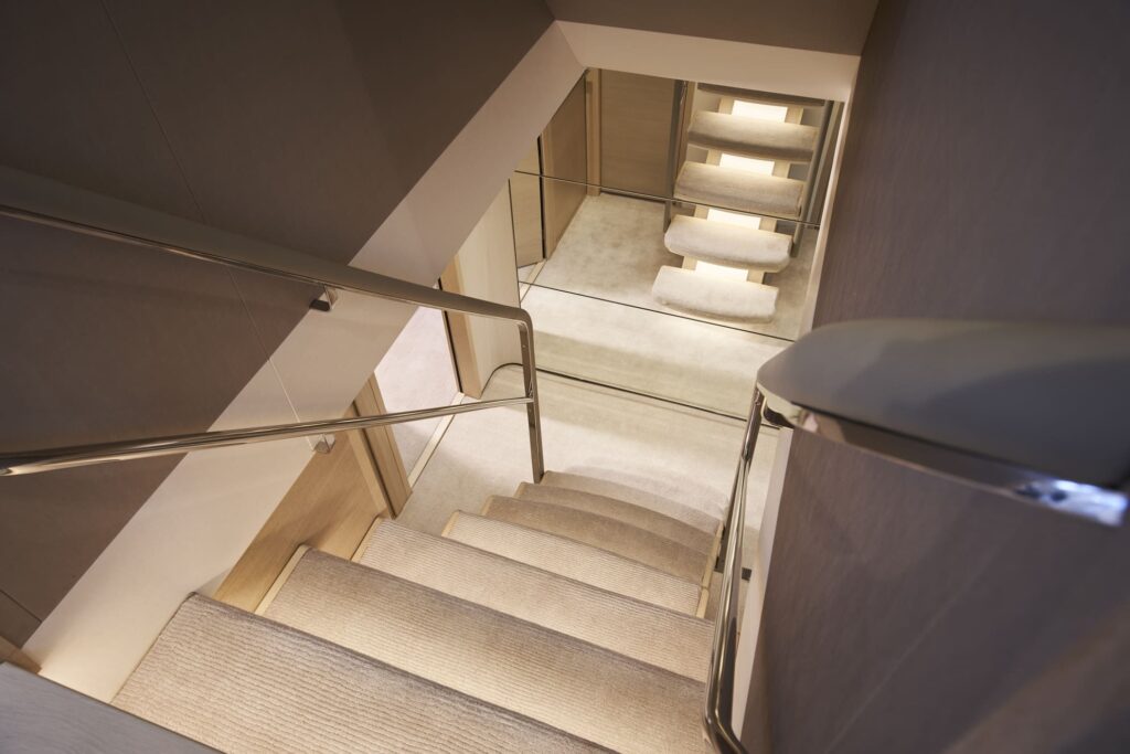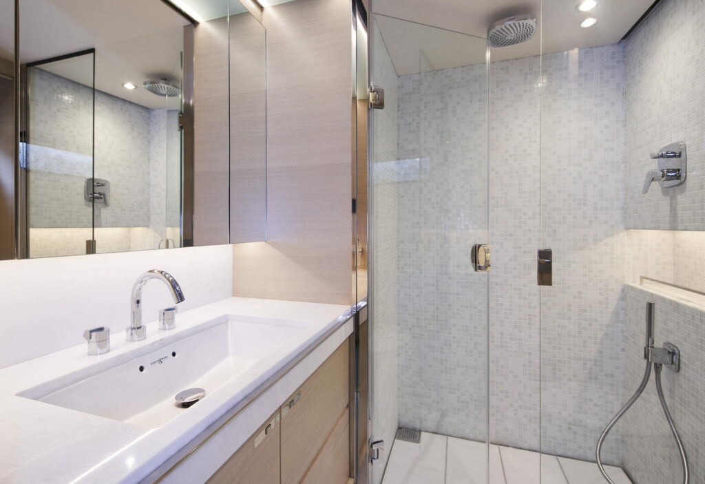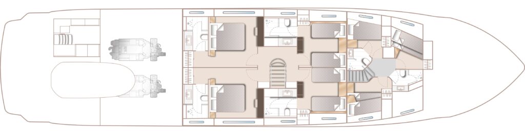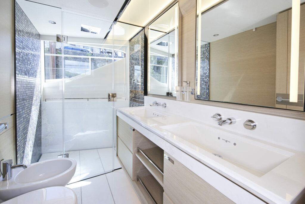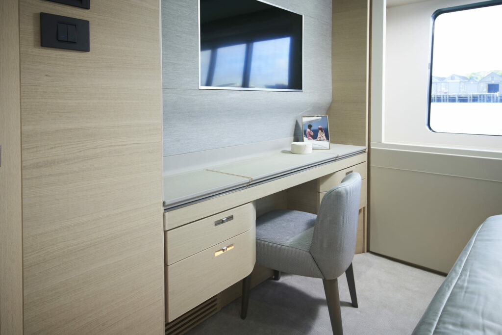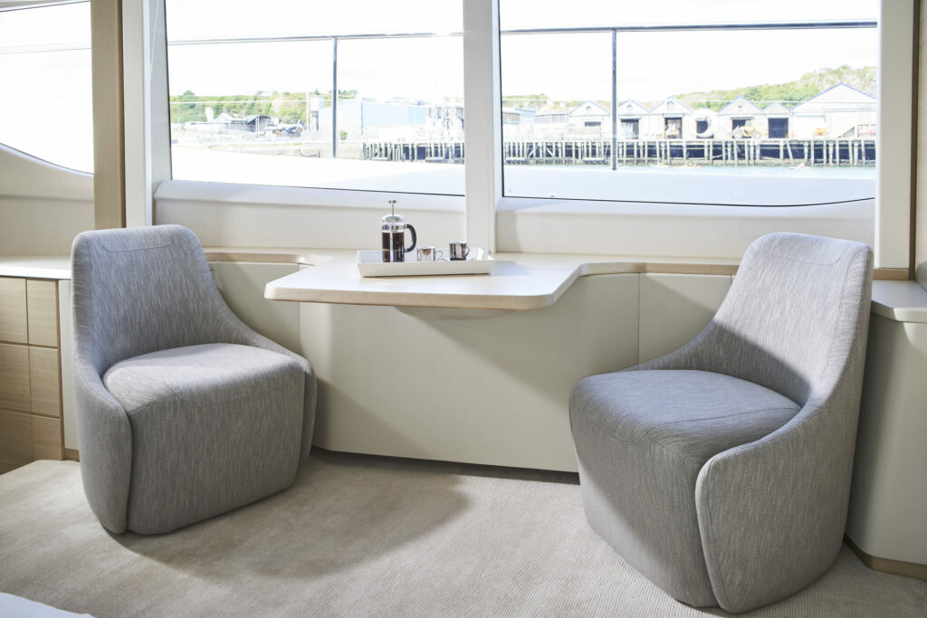 The harmonious, relaxed style of furnishings continues in the private accommodation. Ten guests are accommodated in his three double, one convertible and one twin cabins that offer the highest level of design and finish. With its minimalist style, charming modernity, clean lines and incredibly spacious mastersuite, it is a special space for guests to experience. Surrounded by expansive windows, it offers plenty ofnatural light. Intelligent furniture design solutions enable highly efficient storage capacity without compromising room size. The design scheme continues with other cabins. It also maintains impeccable standards of workmanship and is modern, light weight and beautifully designed. Private bathrooms offer luxury features such as double vanities and deep walk-in showers with outside views.