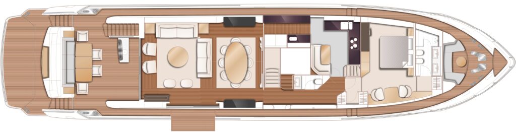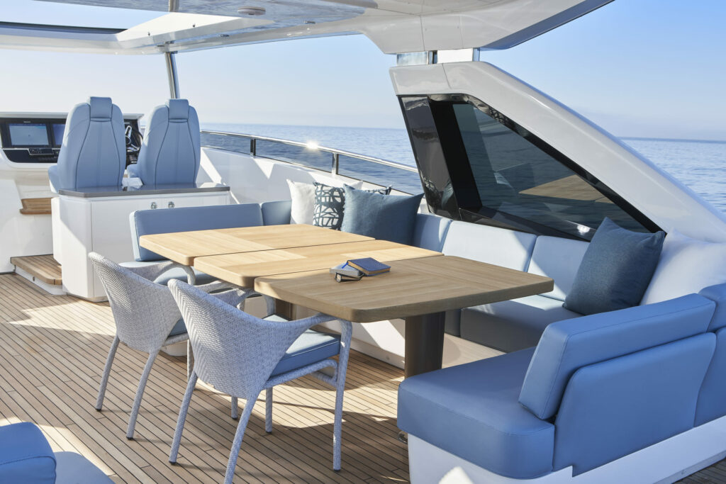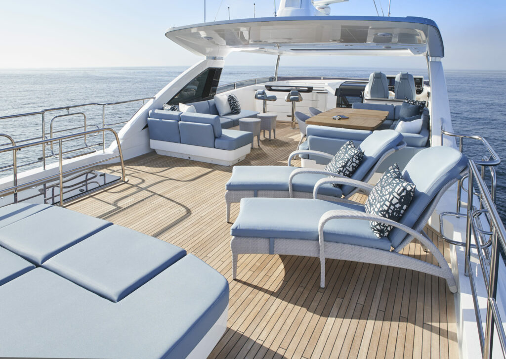 Upstairs on the deck, there are multiple dining and seating areas, from a bar and benches to a daybed and sofacombination, making the most of the side overlooking unobstructed ocean views. This is a yacht where allguests are free to spread their wings and find the perfect place to relax day or night.