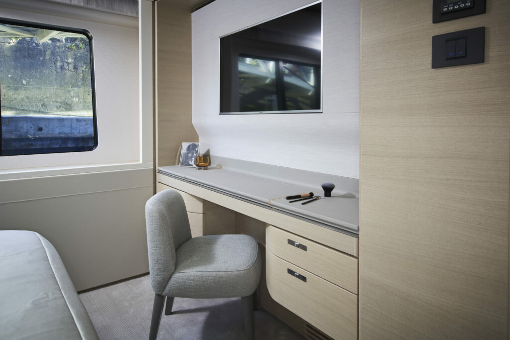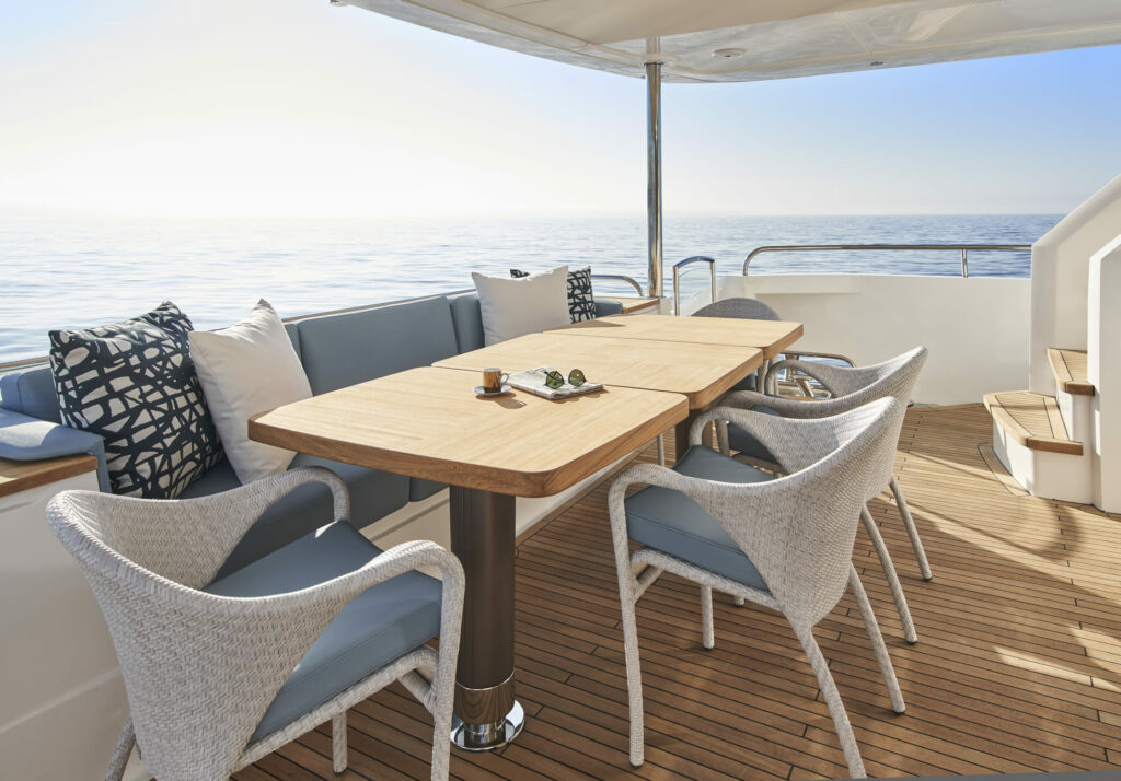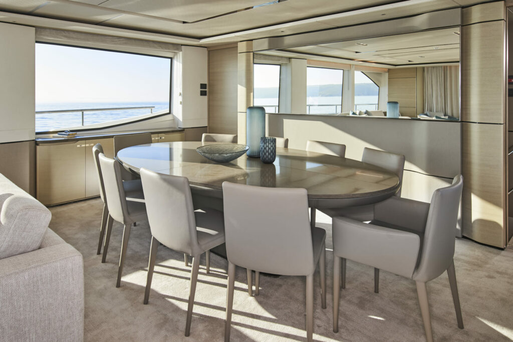 As soon as you enter the salon, you will be amazed at the amount of light that floods this space thanks tomultiple picture windows. The spacious open-plan saloon is spaciously balanced, allowing everyone togather and sit back and relax in the spacious and comfortable lounge seating. In addition, the wide slidingdoor placed in the center allows the sea breeze to warm in and allows you to enjoy the wonderful view.A beautiful 10-seat dining area with an oval table surrounded by large windows overlooking the ocean makes dining on the Hallelujah Charter Yacht special.