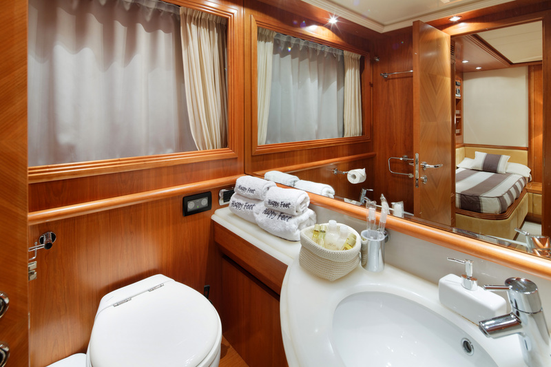 Happy Feet’s elegant, interior layout sleeps up to 8 guests in 4 rooms, including a master suite, 1 double cabin and 2 twin cabins. She is also capable of carrying up to 3 crew members onboard to ensure you and your guests enjoy a luxury charter experience that is truly memorable, making use of the superyacht’s impressive amenities.
