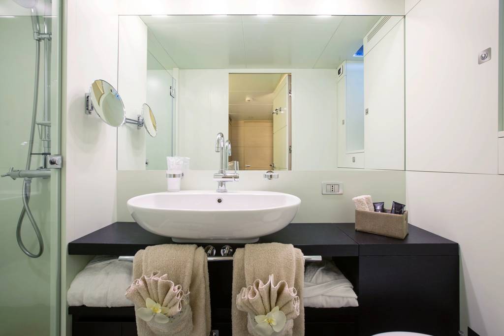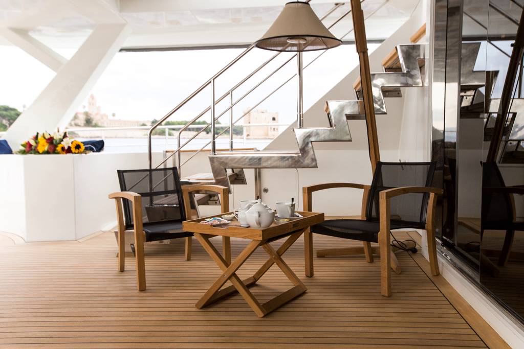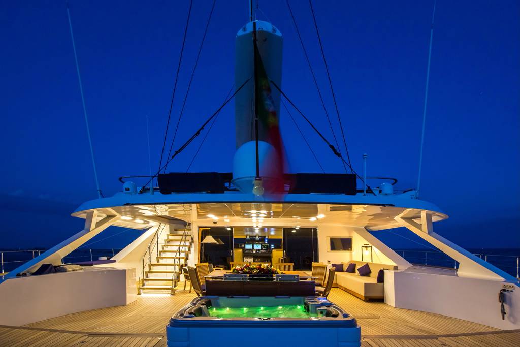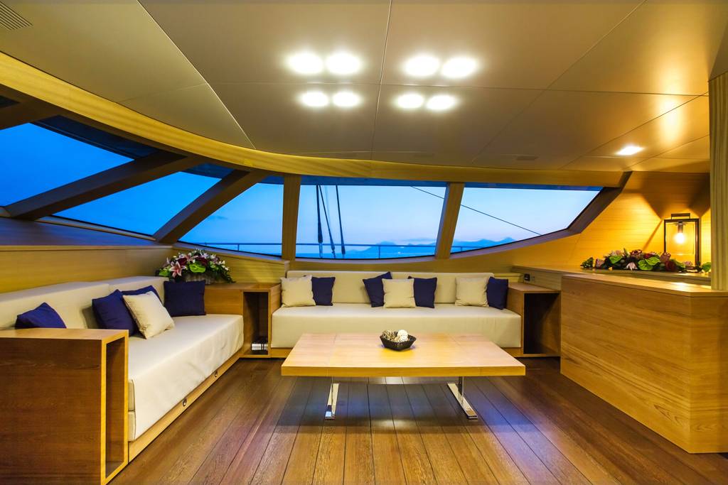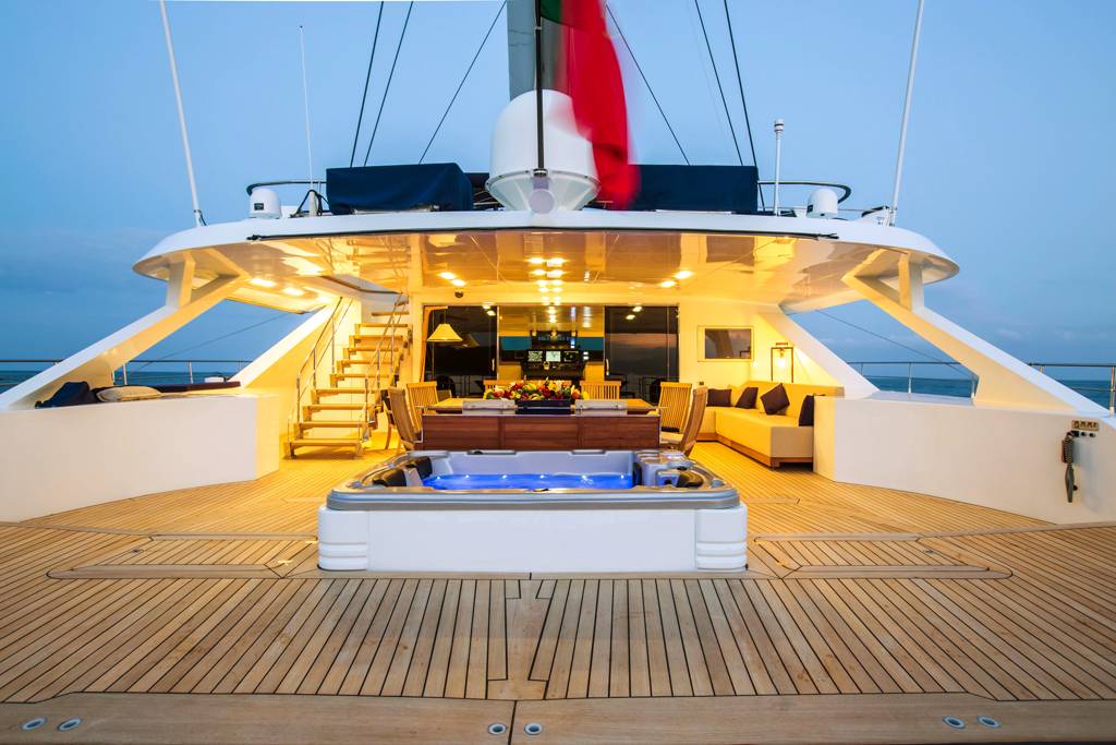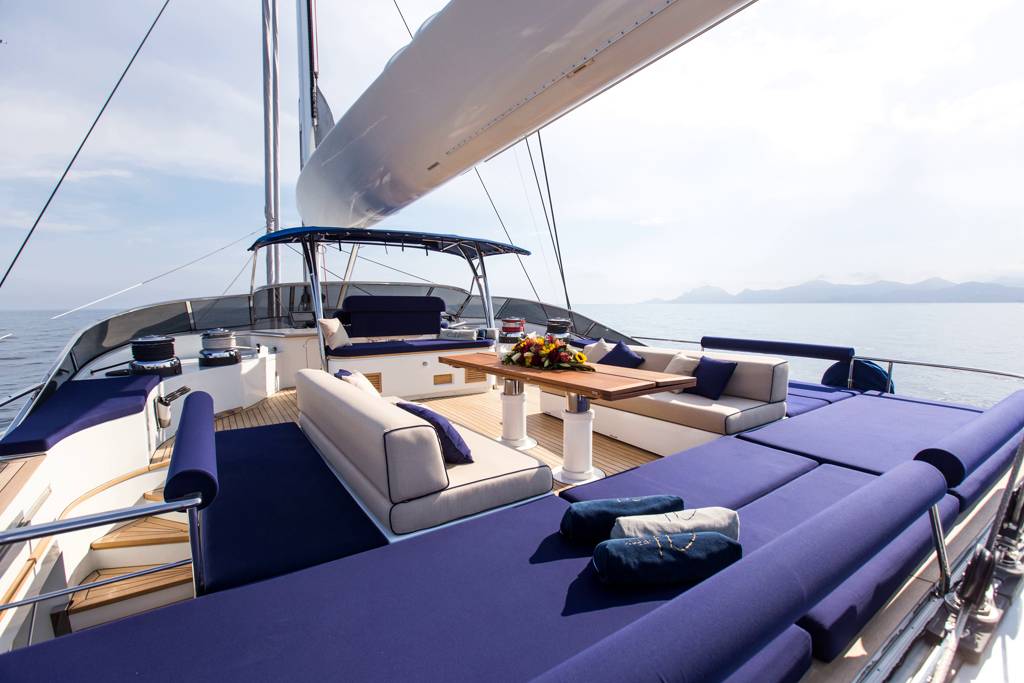 S/Y HUTIANE can accommodate eleven guests in four staterooms, comprised of two doubles and one twin. This floating palace will seduce you with its bright and spacious interior that has been stylishly decorated in sophisticated, modern furnishings and elegant wood panelling and floorboards. Outside, there is no shortage of deck space. Large sun deck where guests can relax below the sails.