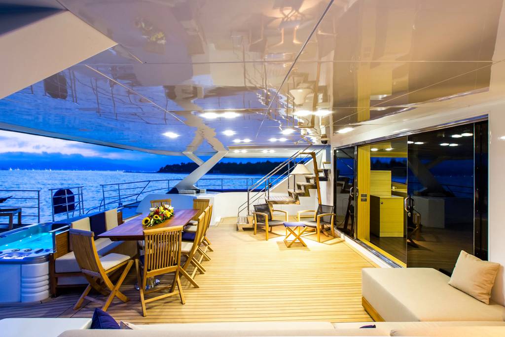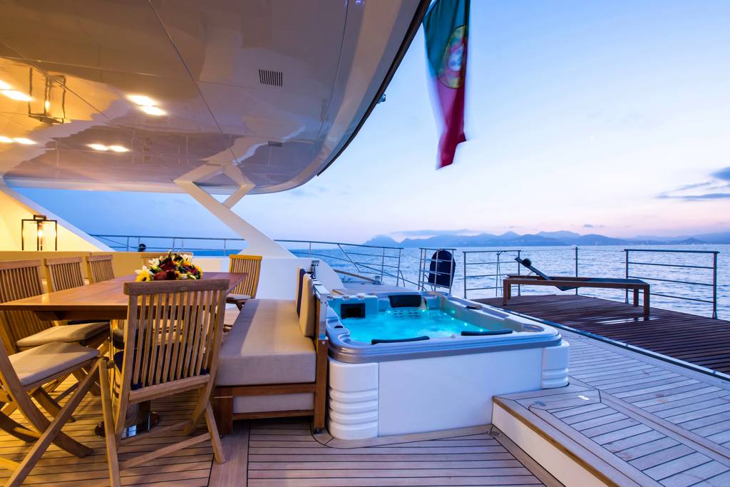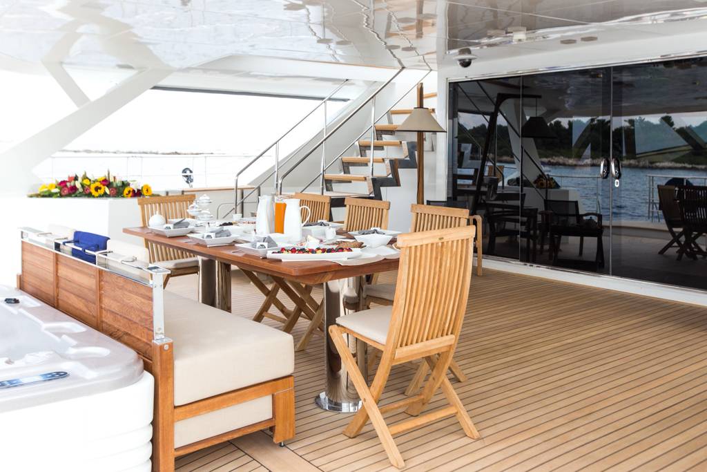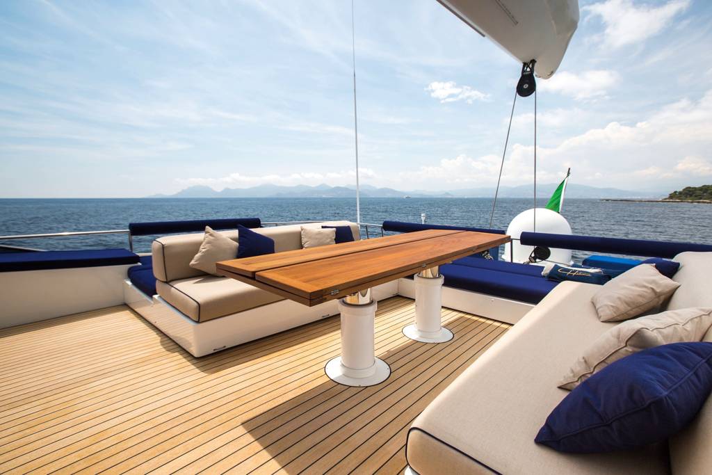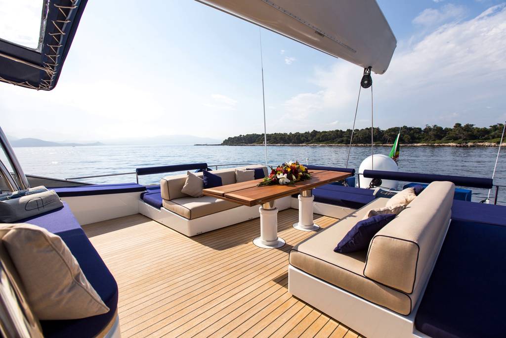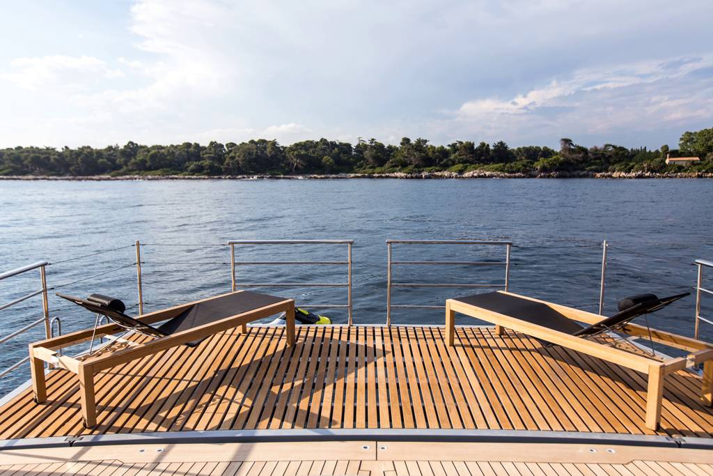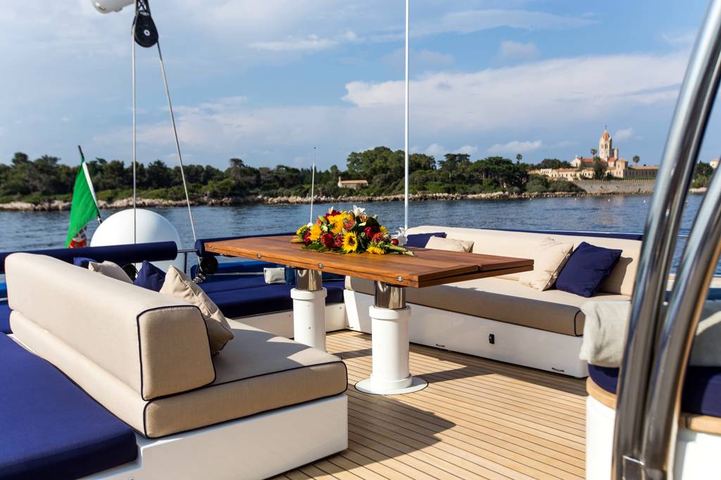 Huge aft deck ideally set up for al fresco dining which also boasts a Jacuzzi. And to conclude the foredeck which offers further outdoor space for guests to unwind and admire the surrounds. With a cruising speeds of 11 knots, this amazing vessel is the perfect sailing yacht for exploring the secluded coves found along the coast of Corsica or Sardinia for instance. Guests are encouraged to take full advantage of the large set of toys found on board.