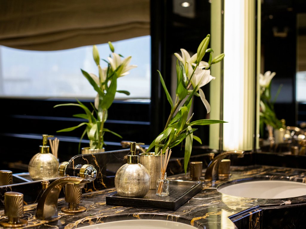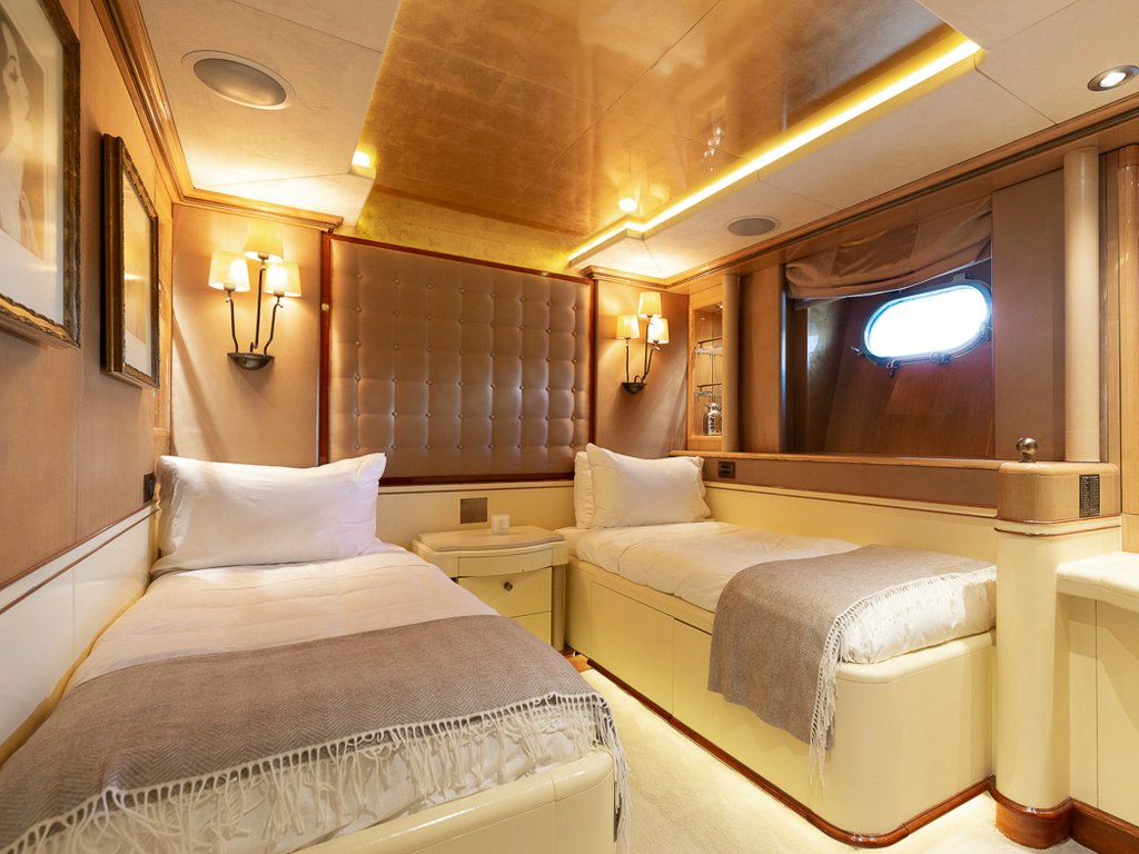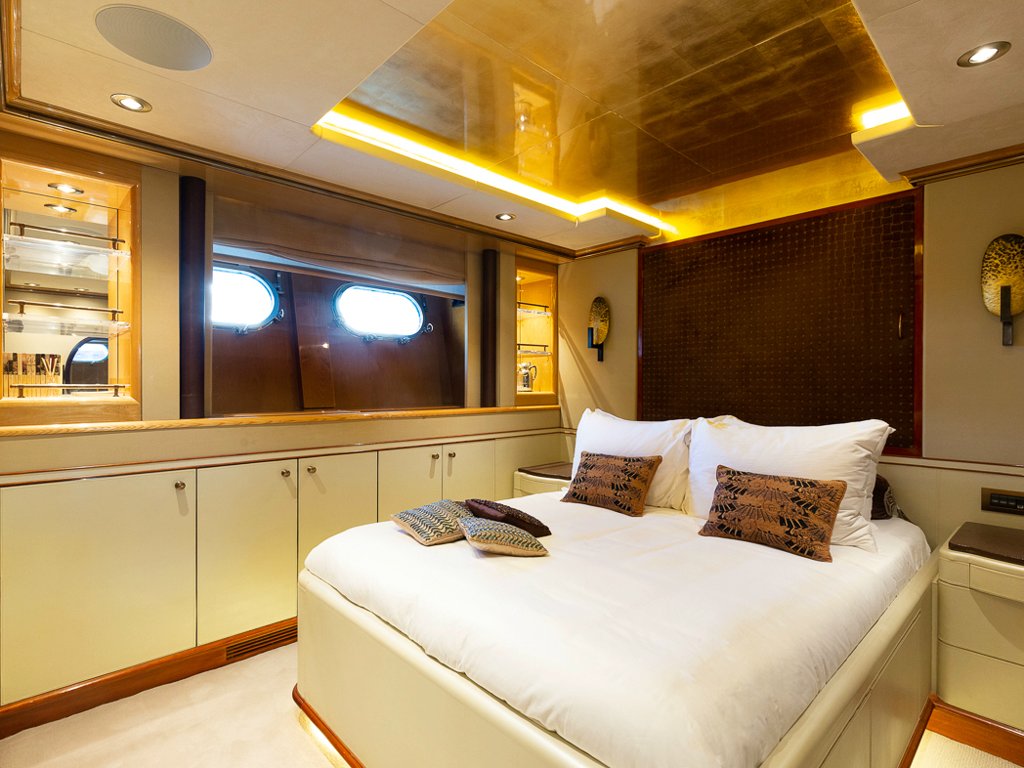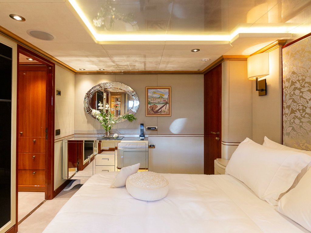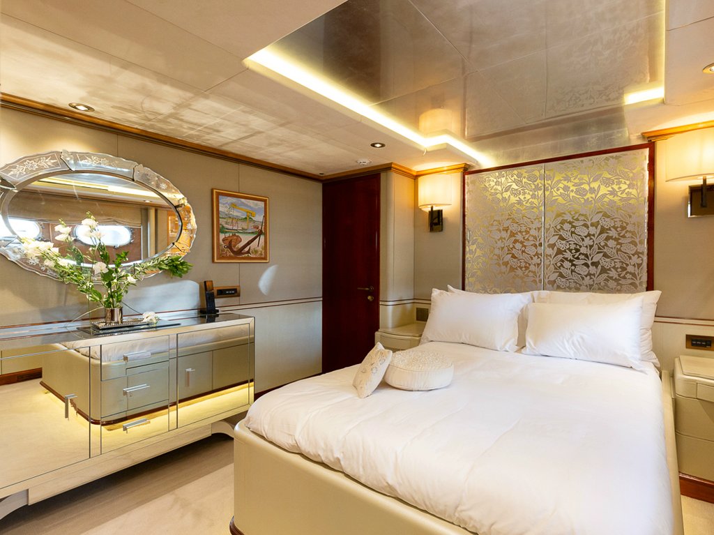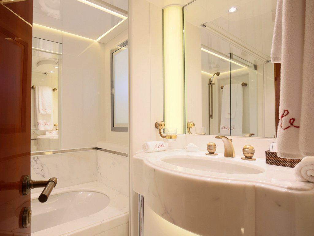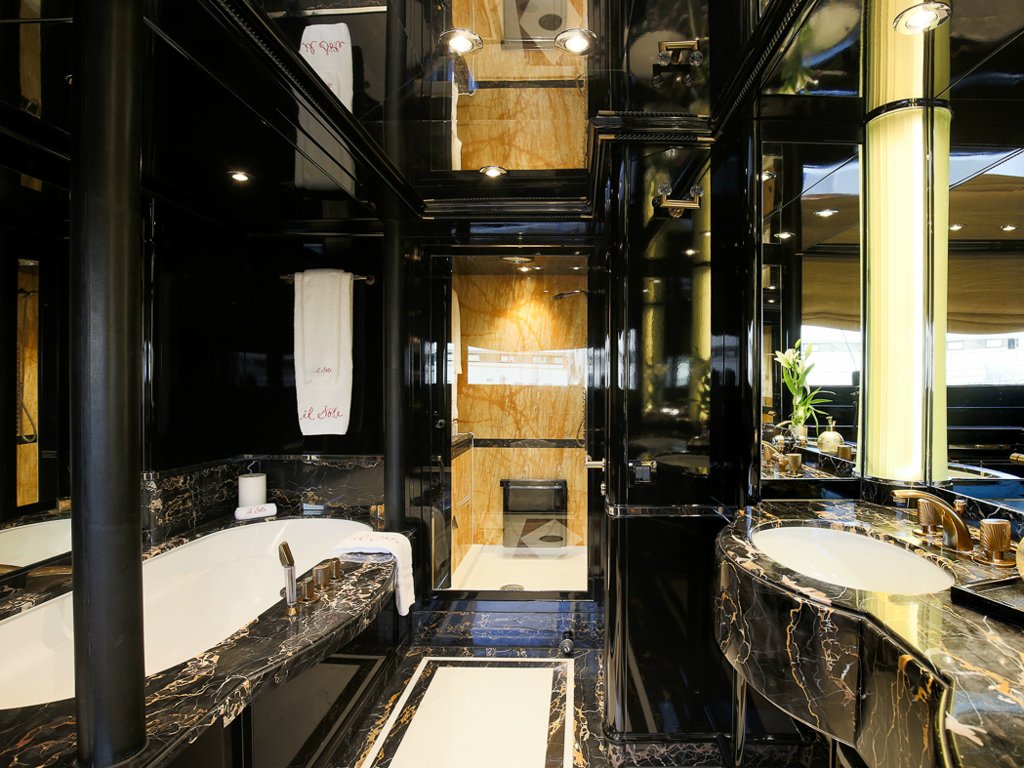 Il Sole’s interior configuration has been designed to comfortably accommodate up to 12 guests overnight in 6 cabins, comprising a master suite/ VIP stateroom, 2 double cabins and 3 twin cabin. It is also capable of carrying up to 10 crew onboard to ensure a relaxed luxury yacht experience.