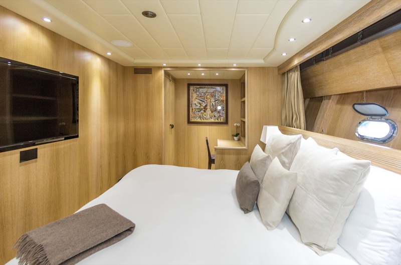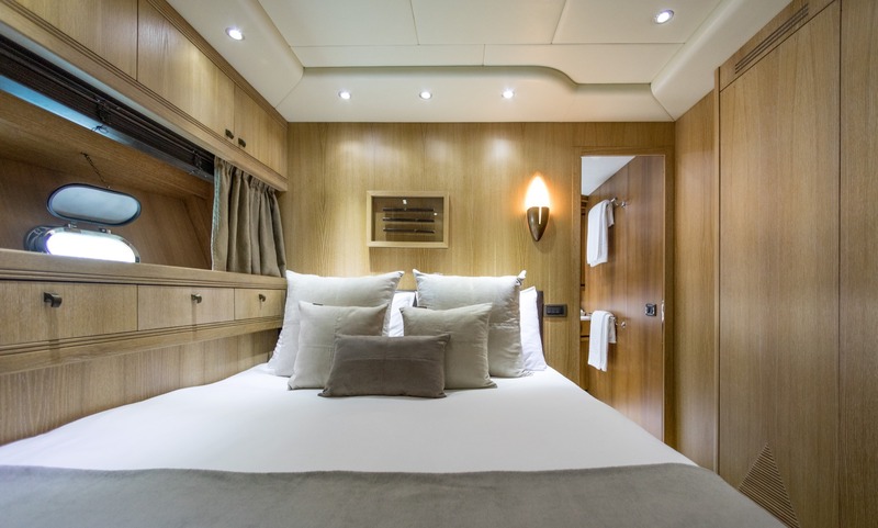 The spacious sundecks make it easy to enjoy the Mediterranean outdoors. Two large sun-pads, one at the front deck and the second at the fly, are perfect for spending unlimited hours of sunbathing or simply relaxing during the cruise. A large platform at the aft deck makes it easy and safe to access the crystal-clear waters of Mediterranean Sea.