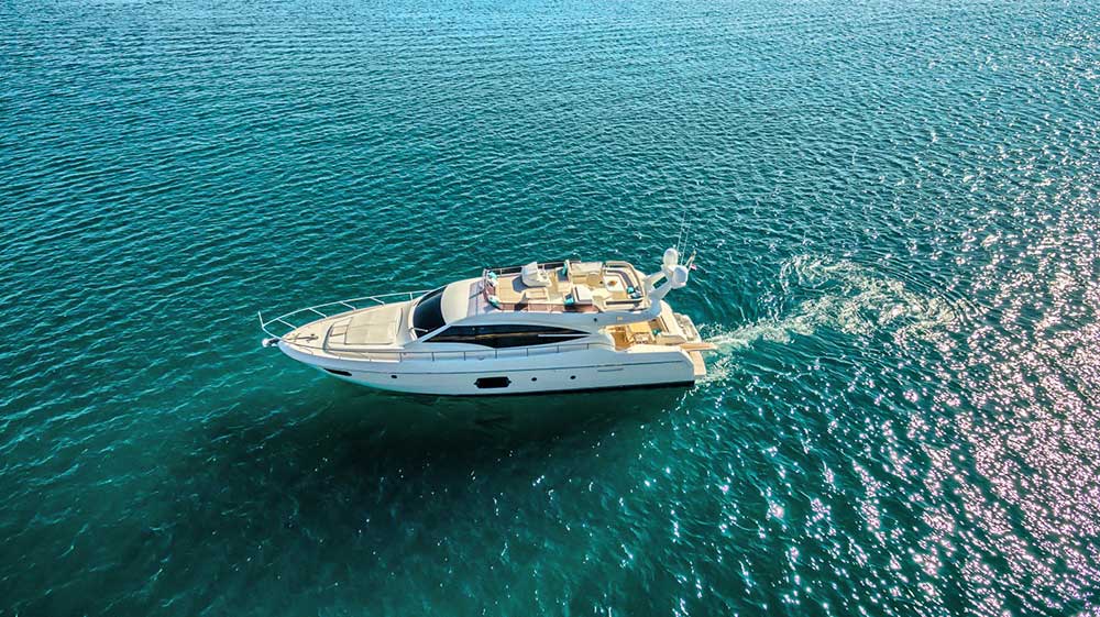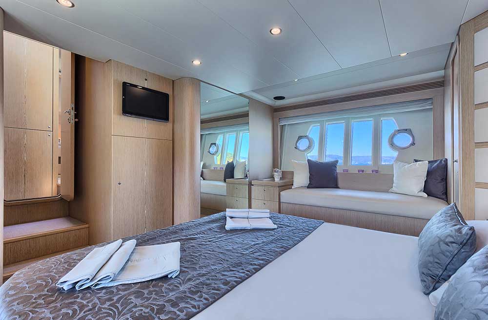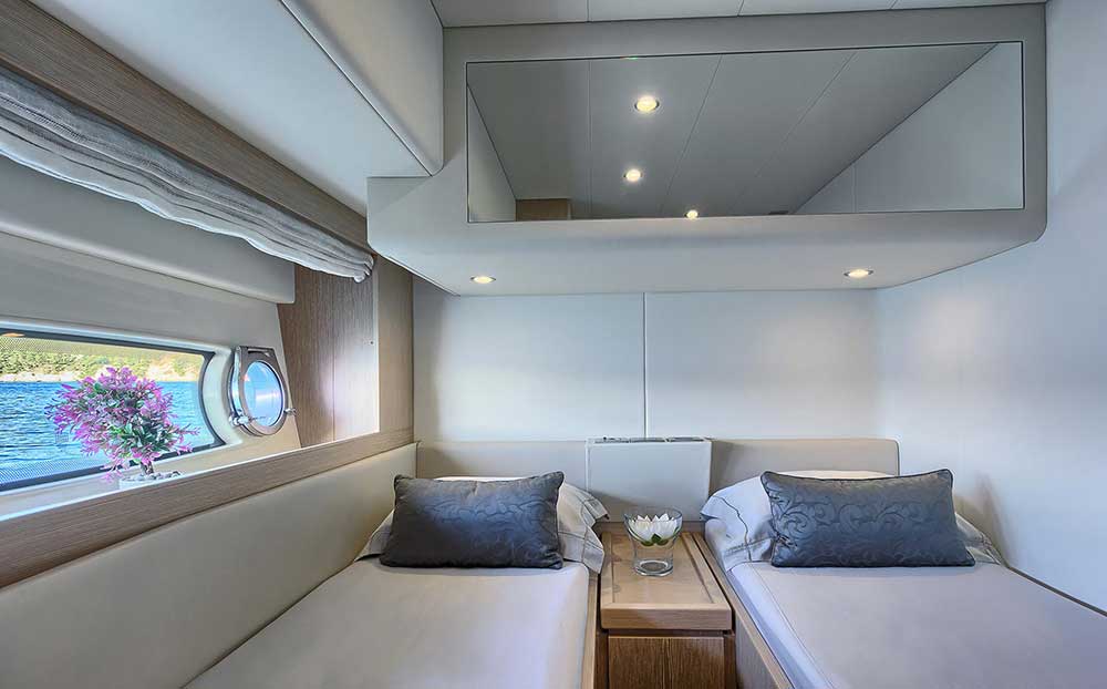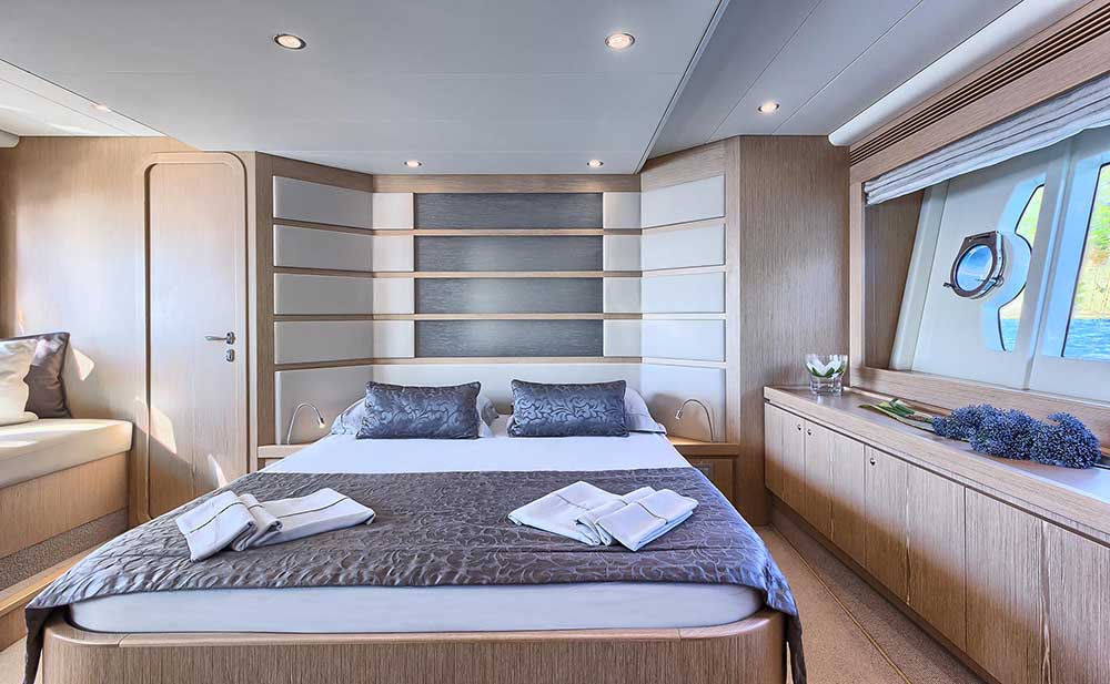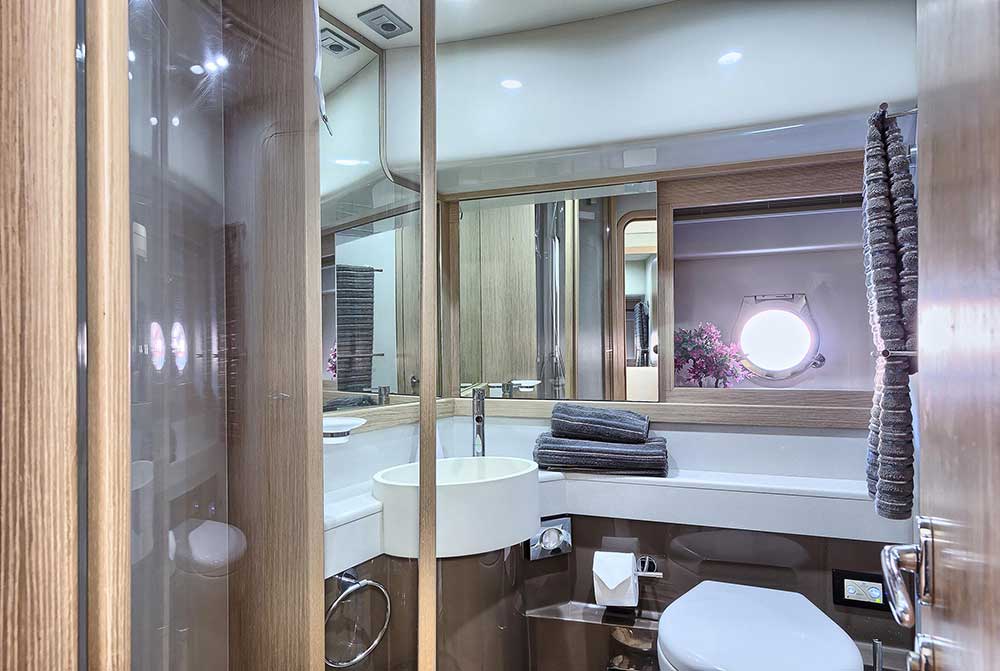 The Ferretti 620 is a dynamically-styled and designed yacht with standard Italian lines that combine the performance and beauty with the utility and accommodations of larger motor yacht. She is a very sophisticated flybridge motor yacht which offers great equipment for demanding guests. The lower deck has two large guest cabins and a full-beam master cabin with large windows, typically a larger yacht characteristic. Her master cabin is remarkably large with a double berth and good-sized wardrobe with sufficiently of storage areas. Her two other private staterooms have their own bathrooms.