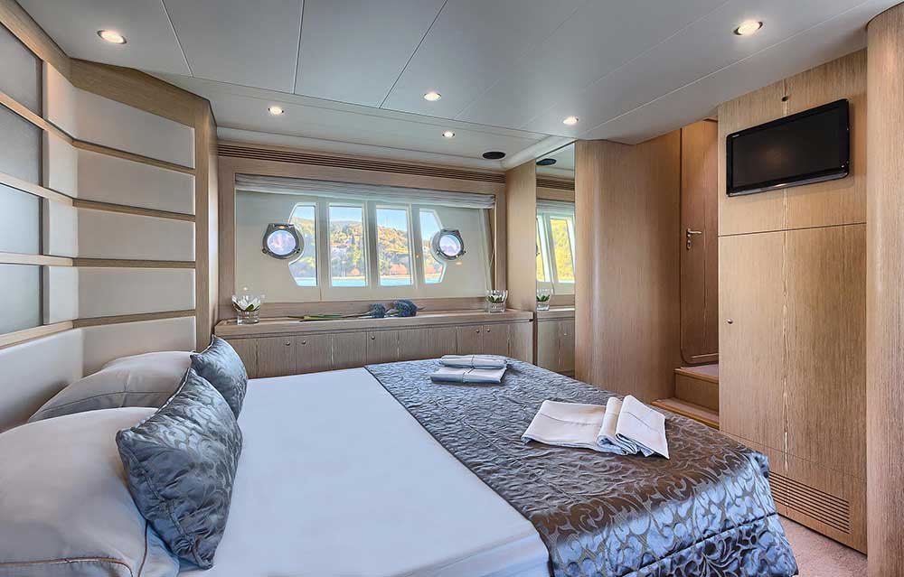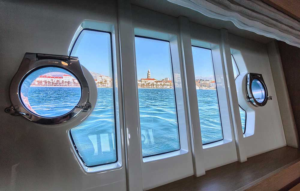 Externally, the profile is ‘lighter’ with the insertion of four large windows in the hull: two large windows with portholes which can be opened have been fitted at bow in the VIP cabin two oval windows with double portholes in the guest cabins.