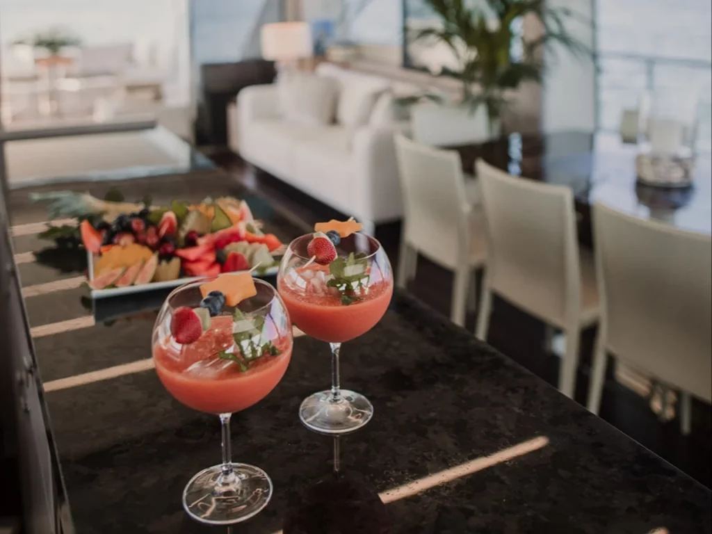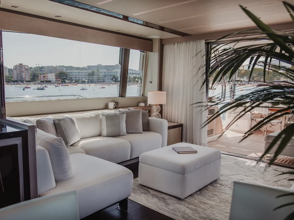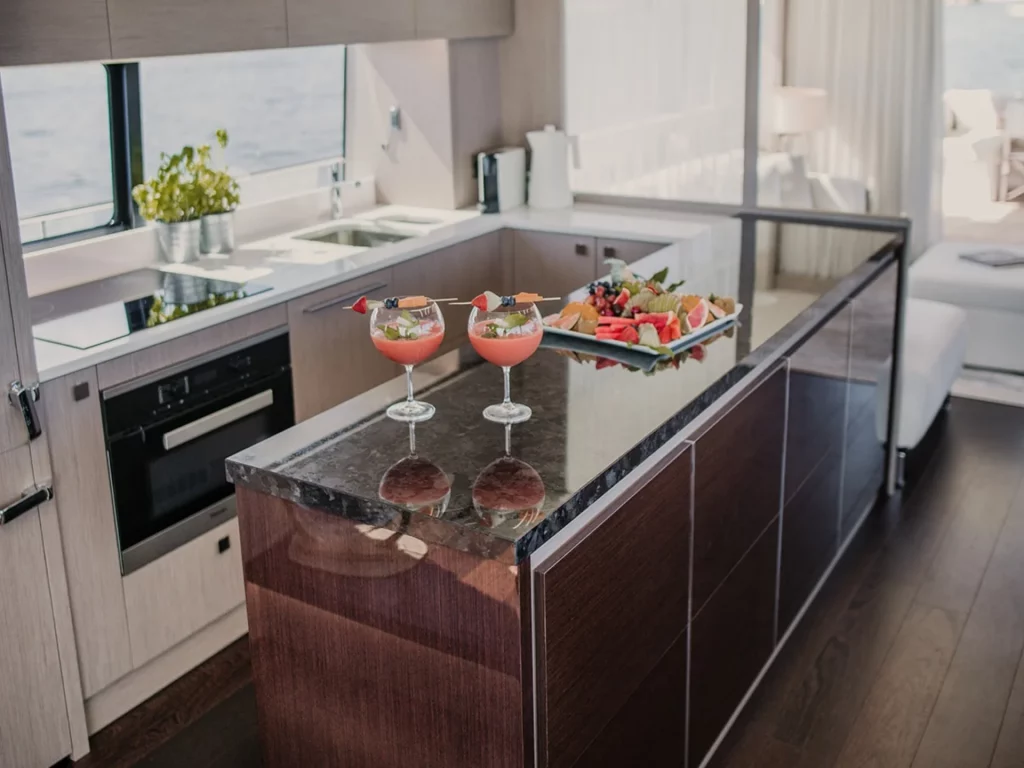 Inside the ship, you will be welcomed by natural light coming inthrough the many glass panels, and youwill feel a sense ofopenness and peace from the moment you board the ship. The maindeck offers nearly360-degree views of your surroundings. Herstriking layout leads to the foredeck with a large double bedandfront lounge seating, inviting relaxation and socializing. HerPortuguese bow was designed with cleveruse of space, offering alarge area to sit comfortably and enjoy the outdoor scenery.