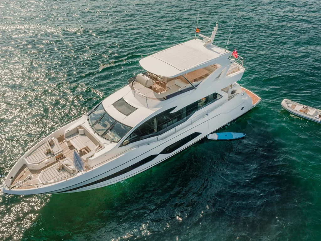 Lady M is a Sunseeker 76 yacht delivered in 2019. It has animpressive glass-enclosed area and the maindeck offers nearly360-degree views of its surroundings. From the exceptionalseaworthiness of her latestDeep-V hull design to the supremespace of her beautifully appointed deck, Sunseeker speaksforperformance, style and spaciousness, and this yacht raises thebar.