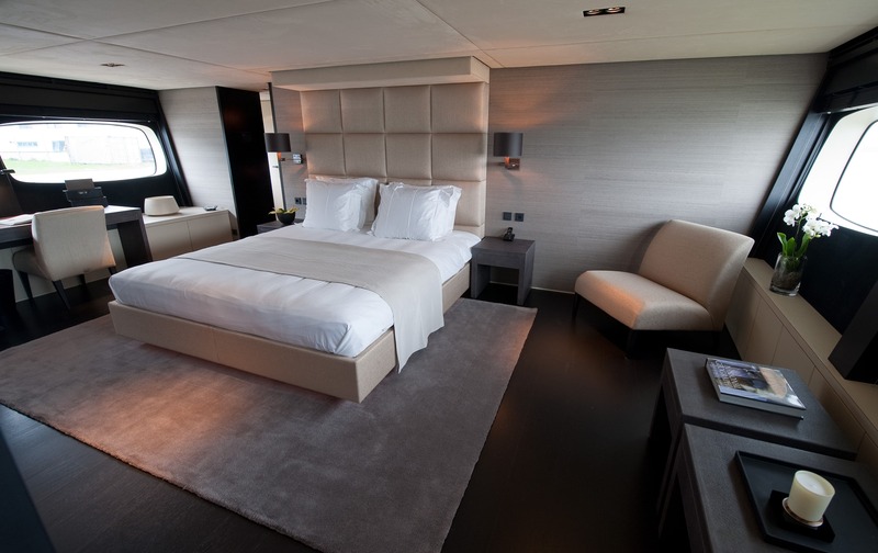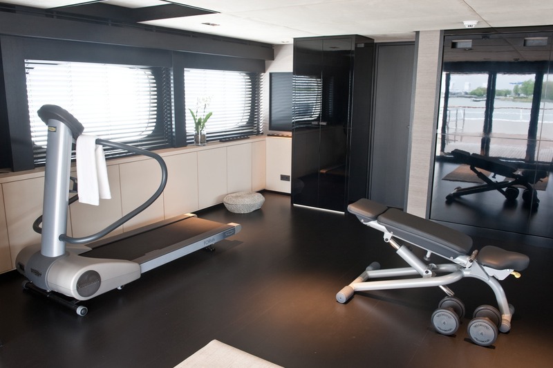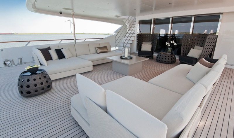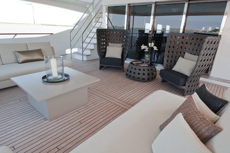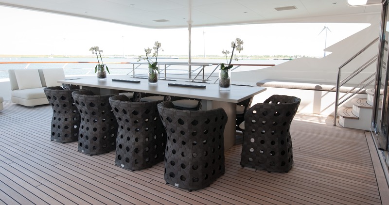 The main saloon and dining room feature a nice bar area and all outside decks have ample seating for large parties. The interior is a contempary look, combination of wood – fabrics and leather accented by lively colors all to the design of the well known Dutch interior designer Piet Boon of Piet Boon Design. The sundeck features a jacuzzi and an additional bar area, with barbecue, ice-maker and fridge.