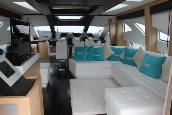 Built in 2012 and refitted in 2016, motor yacht Miss II is a stunning Jaguar 80 yacht charter on the Mediterranean. With amazing use of exterior space and tranquil interior design, Miss is a a real treat. With this Jaguar 80 yacht charter, you will succumb to the luxury of the magnificent Miss. Perfect for day charters, weekend yacht charters or week long yacht holidays on the Mediterranean. Exterior space is generous thanks to intelligent design. Forward is a wonderfully large sunbathing area, with ample cushioning and seating.