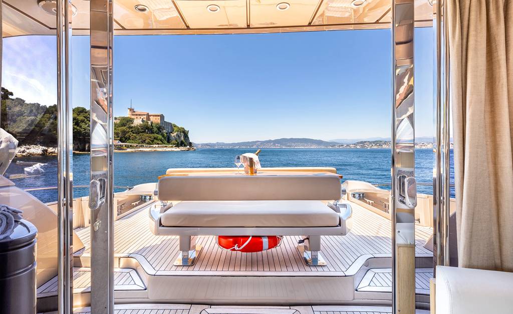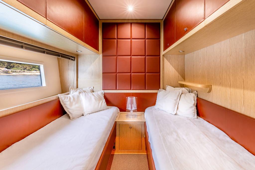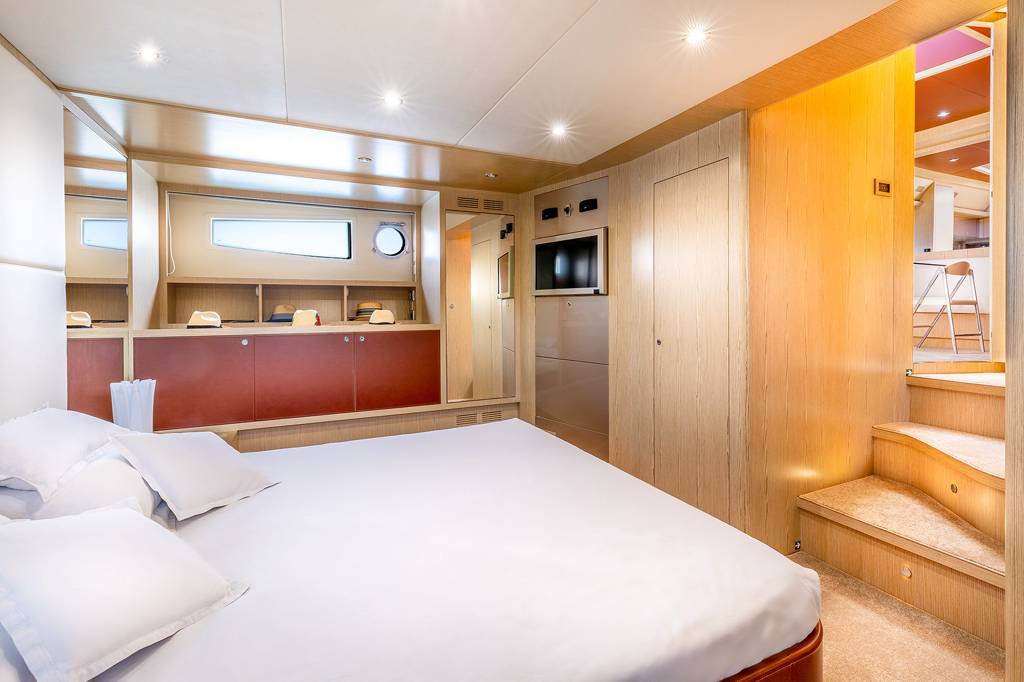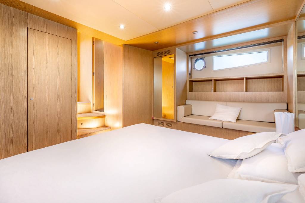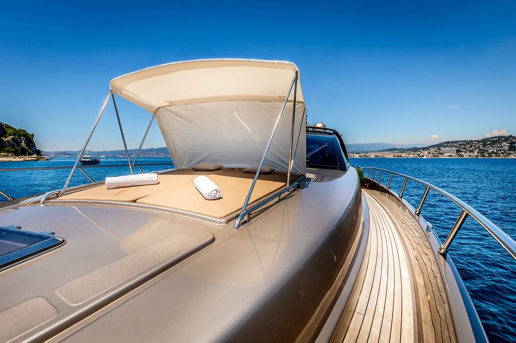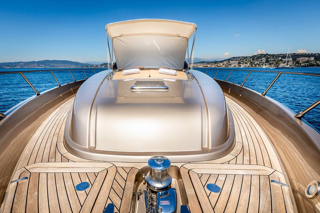 The foredeck has a broad sunbed where the group can rest in the sunshine and enjoy uninterrupted views.The lower deck hosts the crew accommodation in the stern, the guest accommodation forward and amidships with the galley and breakfast area opposite the twin cabin. She is the perfect solution for your charter on the French Riviera. Jump onboard and live the dream.