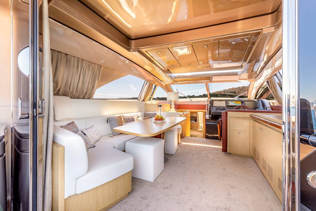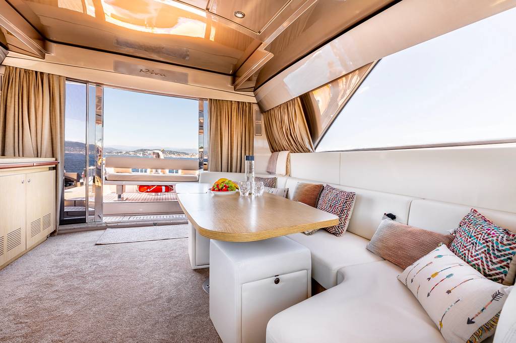 She was built by the Italian shipyard Riva in 2008 and refitted in 2018. She features: balanced indoor and alfresco living spaces, sunroof in the living room, lower deck, galley and dining area, comfortable modern interiors, top speed of 32 knots, air conditioning. From the lower deck swimming platform guests have access to the main deck aft which comes furnished with a sofa along the stern and an aft-facing sofa, between which there is an elevated table.