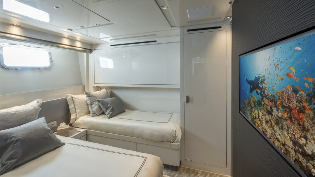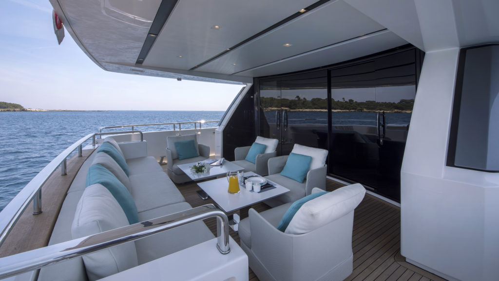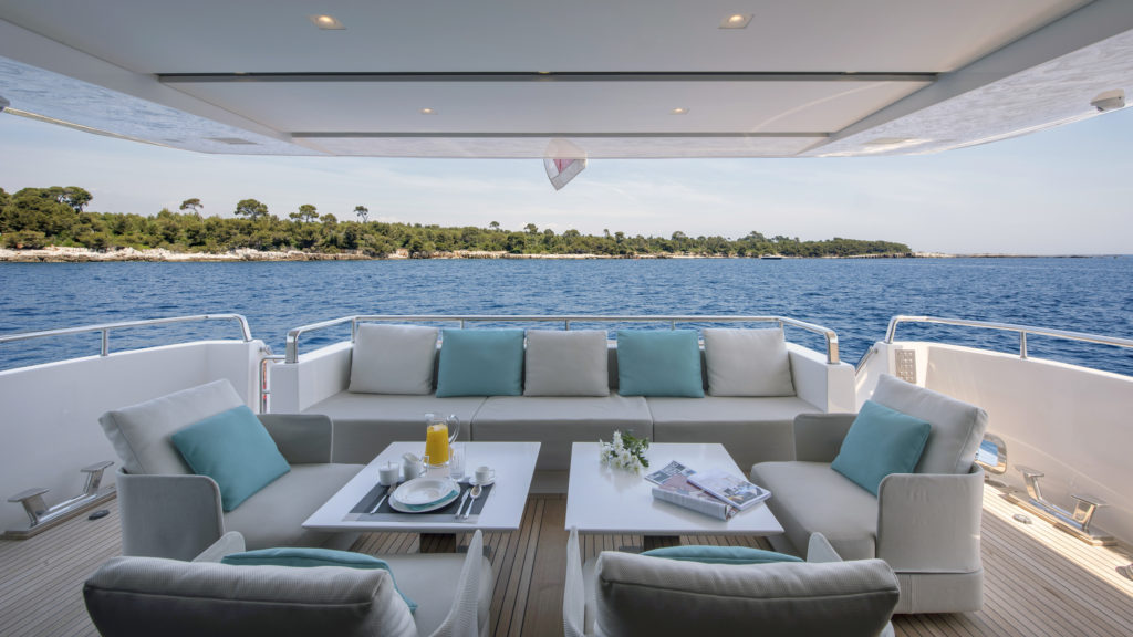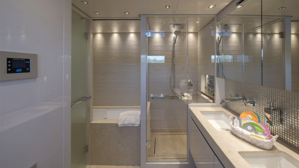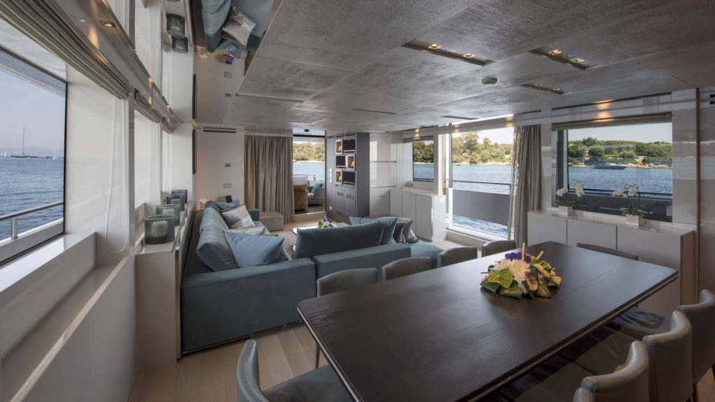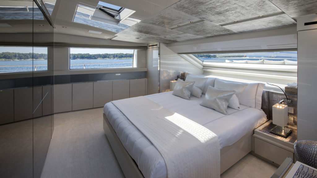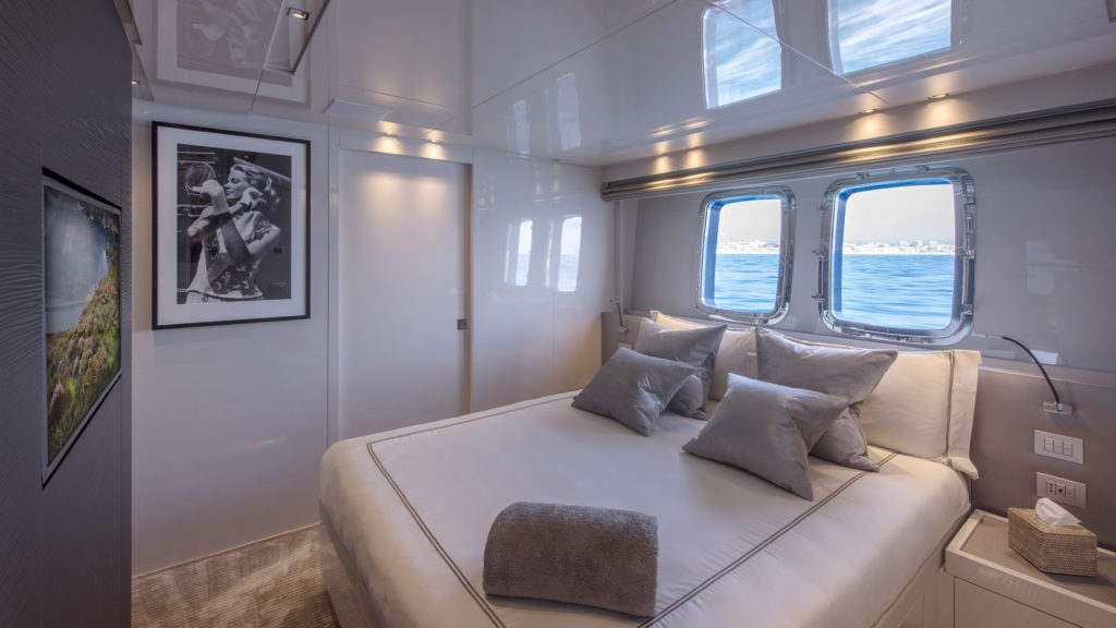 This Sanlorenzo 96′ is an elegant and refined 96’ motoryacht built by Sanlorenzo and launched in 2017. She boasts timeless styling, beautiful furnishings and sumptuous seating feature throughout to create an elegant and comfortable atmosphere. On the main deck, a large lounge with circular sofa, wide dining area for 10 guests and separate galley. The lounge is light and rich inpart due to a perfect mix between materials, woods, stainless steel, nice fabrics and lacquer. For guests entertainment…