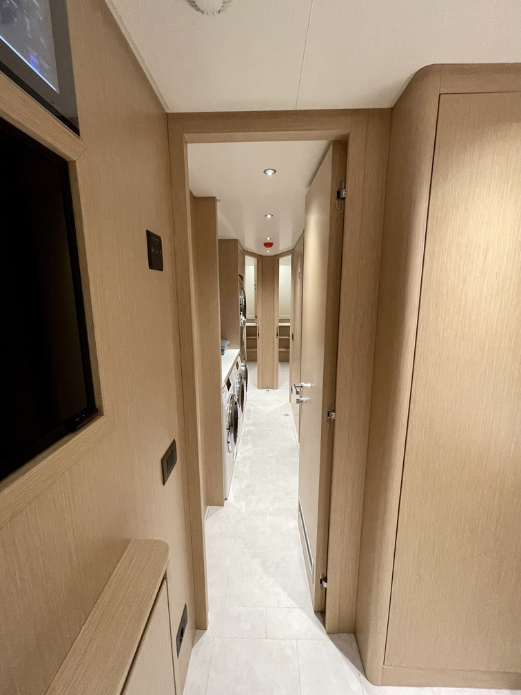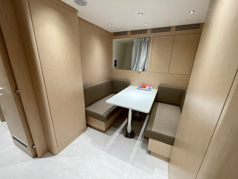 The port side has a side deck running seamlessly from stern to bow which create a huge terrace at the location of the living area once the massive sliding doors are opened.