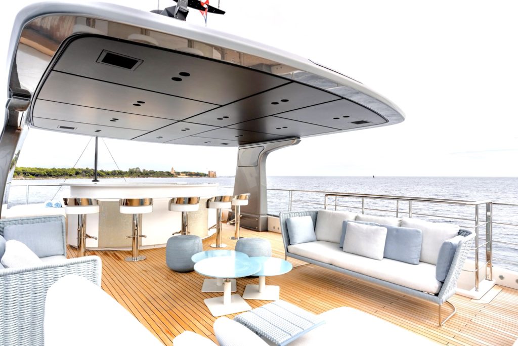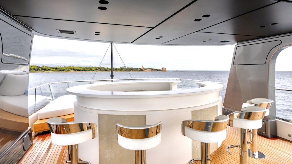 Thanks to its novel configuration, the outdoor living area at the bow of this Sanlorenzo SD118 consists in two interconnected levels, the upper deck and the foredeck which form a very large outdoor relaxation area, accessible directly from the owner’s cabin. A hidden sliding door located under the staircase which connects the two decks, ensuring a complete privacy.