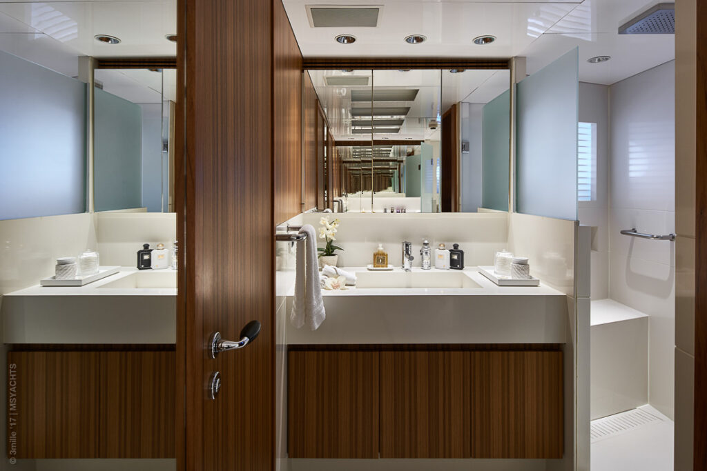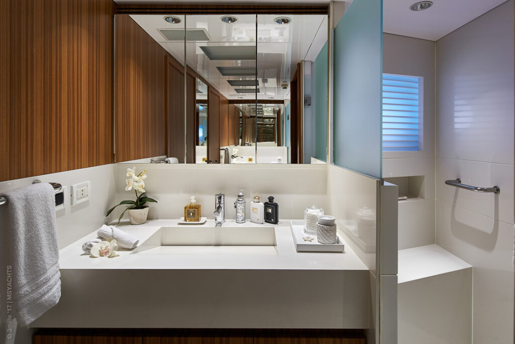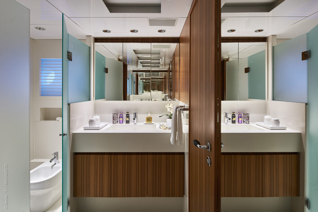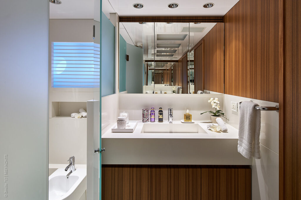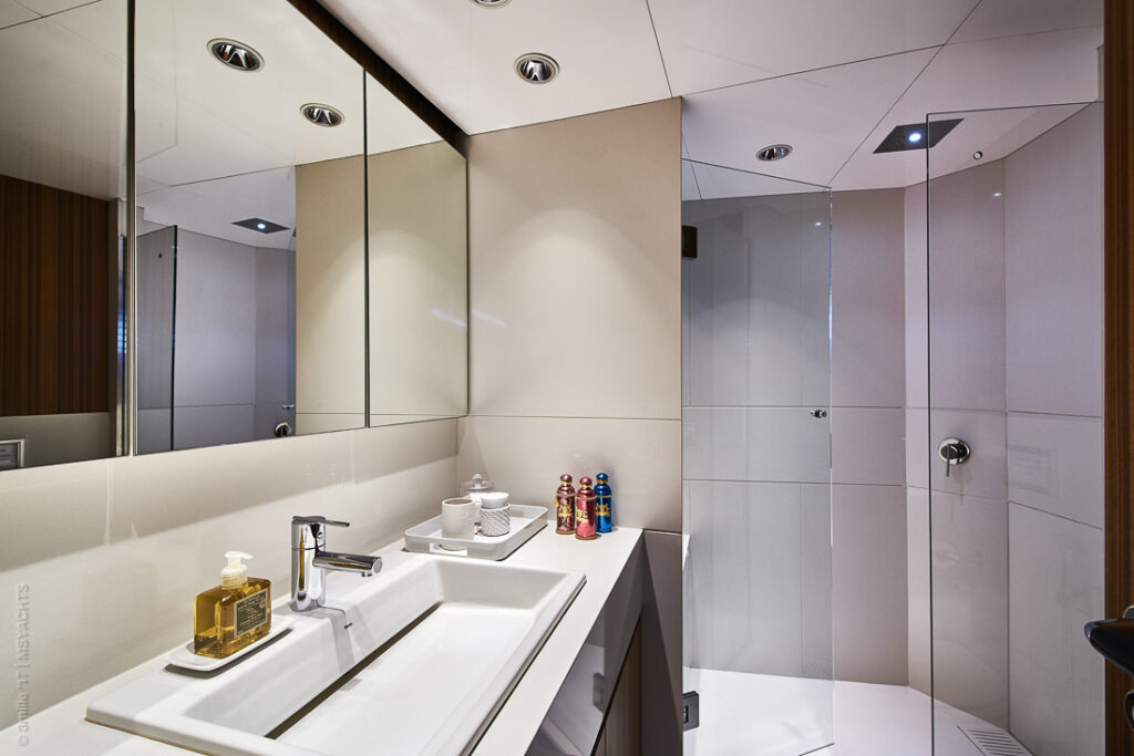 The state-of-the-art interior of this Cannes motor yacht is a stunning design work by LM Design. Thenupper deck lounge features elegant white corner sofas, a coffee table and chairs, as well as a high bar where you can sit and enjoy a delicious drink after a long day of relaxation. There is also a beautifully decorated dining table and chairs for sharing delicious meals. These fine meals can be prepared in the top floor kitchen by our talented chef. Below is another lounge/living room area. Between warm cream carpets and cappuccino-colored sofas, a warm and inviting ambiance immediately permeates, allowing guests to relax and unwind. This is the perfect place to take advantage of our many in-flight entertainment options, including Smart TVs, Apple TV, Spotify, Sky TV, Netflix and iPod docks.