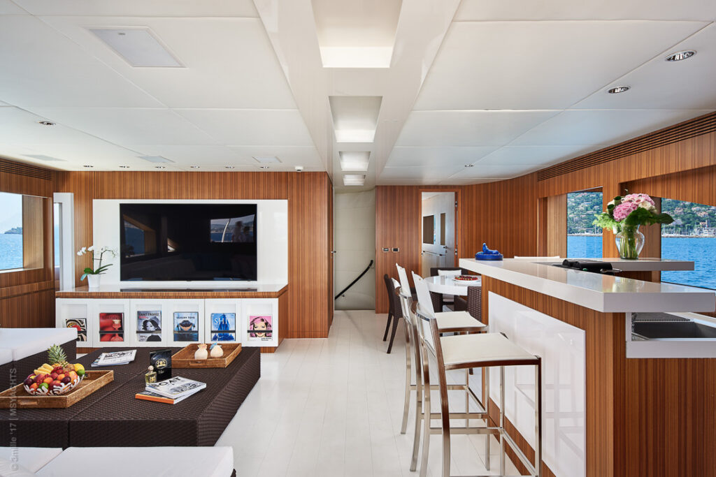 The flybridge and aft upper deck are perfect for those who want to chill under the sun. If you want to read a book in the shade and enjoy the beautiful scenery, the lower aft deck is perfect and you can’t enjoy the Jacuzzi on the flybridge . The best part is enjoying the warm bubbles while enjoying the scenery as far as the eye can see.