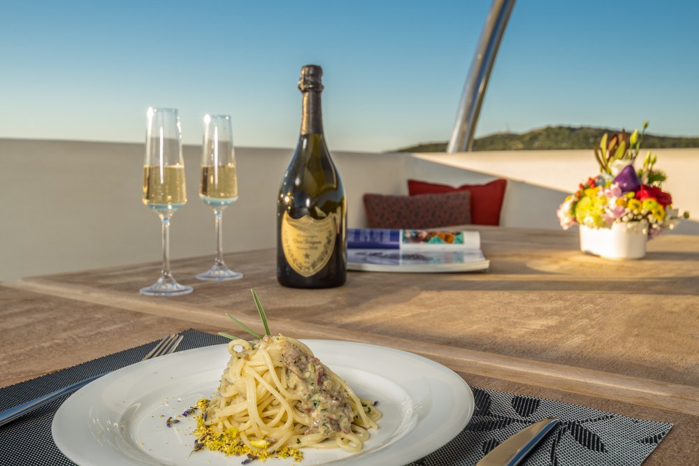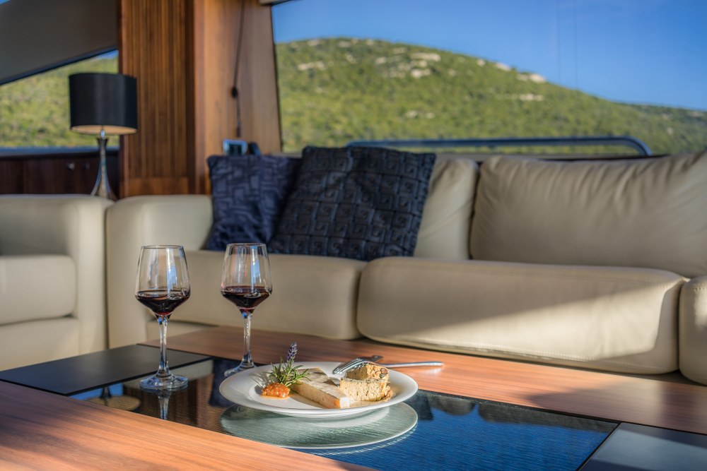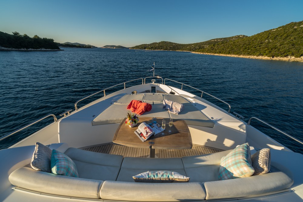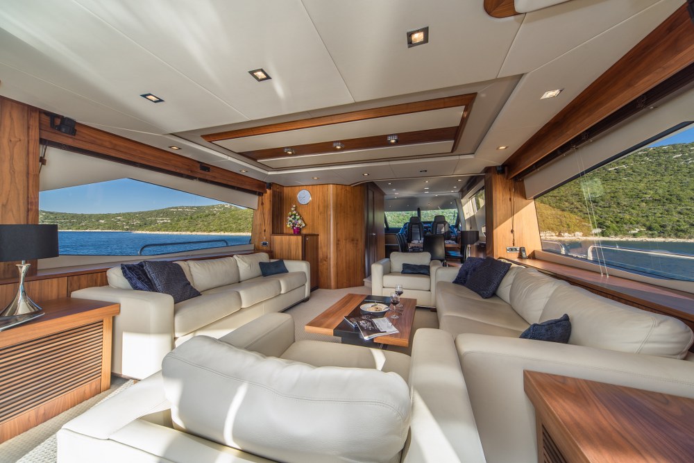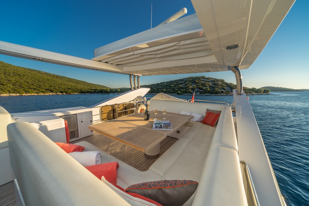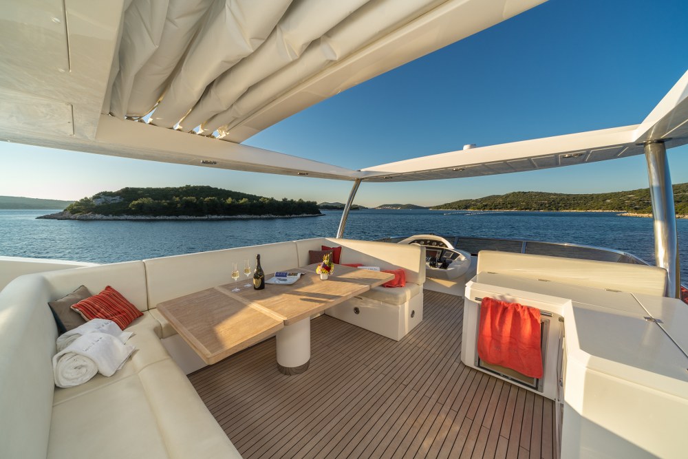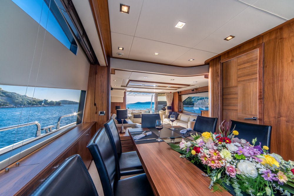 The most magnificent is the master stateroom, with its walk-in closet, large en suite, and sofa seating area. The spacious salon is full of natural light thanks to large windows and full height sliding doors, that lead to the cockpit. Her professional crew of 3 makes sure that your every wish is fulfilled with the highest standards of service. Expect caring and kind hearted service, and amazing food prepared by your personal onboard chef. She is a quite fast motor yacht. Her cruising speed is 22 knots, and maximum speed is around 30 knots.
