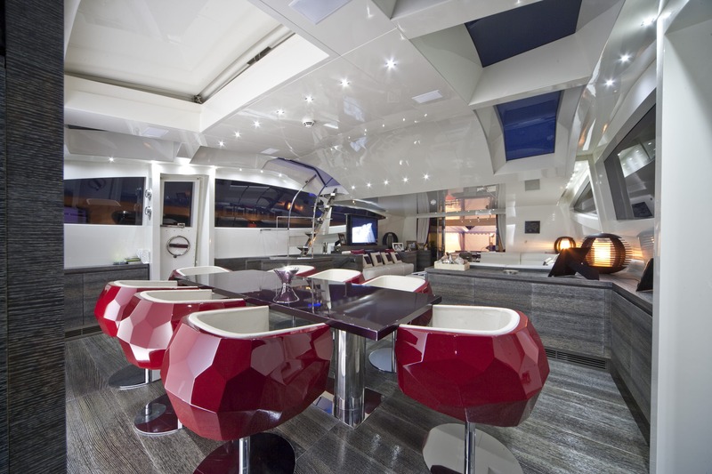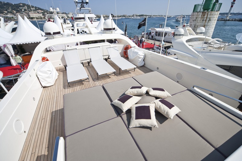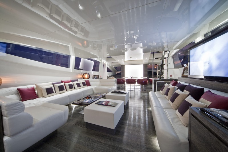TOBY offers a spacious salon with a warm wooden flooring, white leather sofas to port and starboard with bright coloured cushions and a 46″ LCD TV with entertainment system. Further forward and adjoining the main salon is the formal dining area with a beautiful dining table. Above there is an opening sunroof, enabling guests to see the stars at night, or enjoy a refreshing breeze, or sunshine during the day. Large windows on either side of the yacht produce plenty of natural light. There is an additional lower salon with library and TV screen. This stunning luxury yacht boasts wide deck spaces with a very spacious top deck a large sundeck area a huge circular settee ideal for alfresco dining able to accommodate up to 20 guests comfortably Astern (cockpit) there’s a large dining table for 10 guests with mini-bar and a comfortable sundeck space with mattresses.